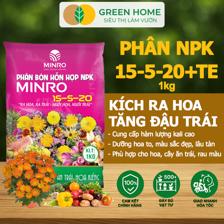 Thông số kỹ thuật Phân NPK 15-5-20 Greenhome, Minro, Bao 1Kg, Kích Ra Hoa, Tăng Đậu Trái Trên Kiểng, Cây Ăn Trái, Củ