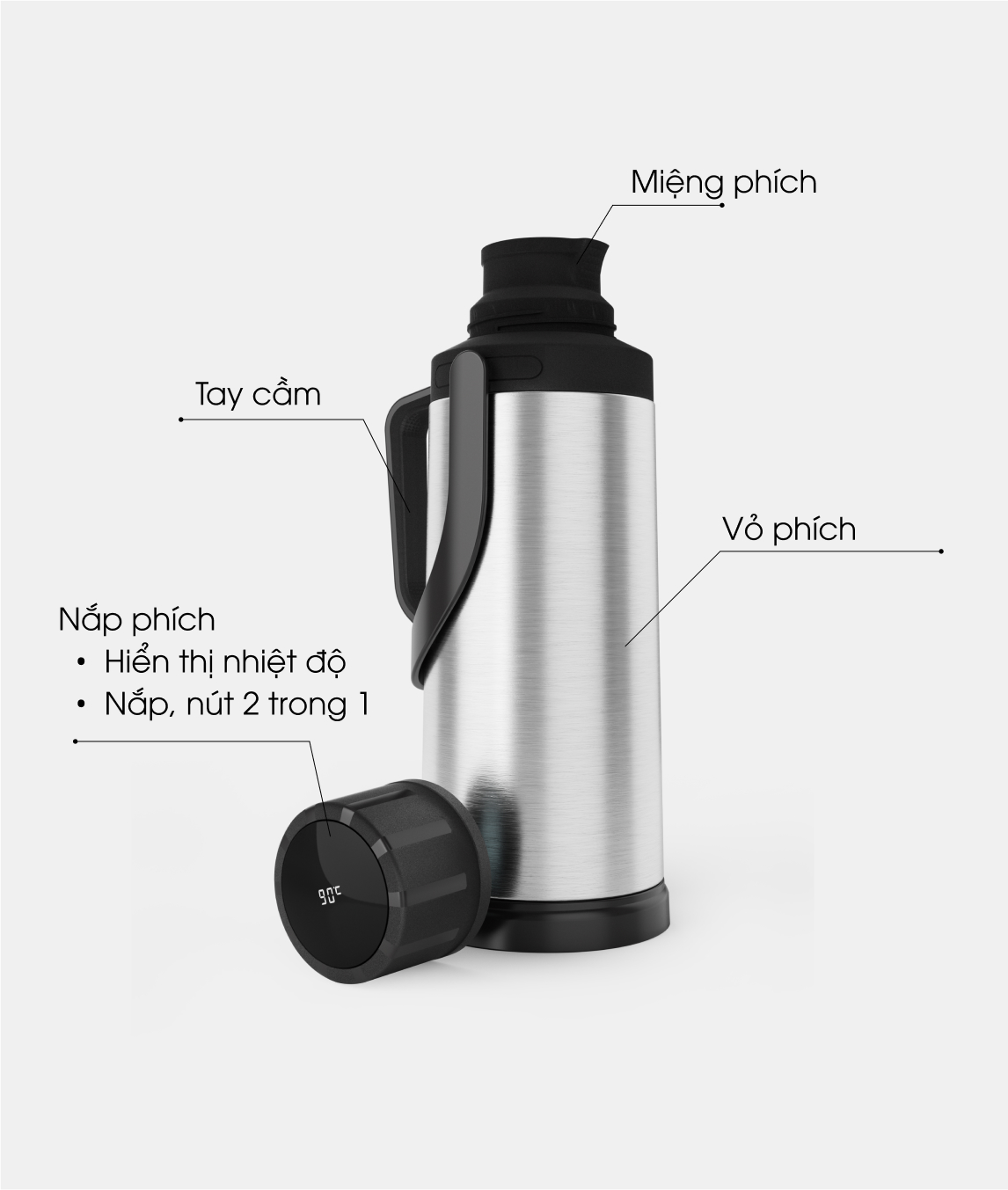 Nắp có hiển thị nhiệt độ, giúp người sử dụng dễ dàng kiểm soát nhiệt độ trong phích