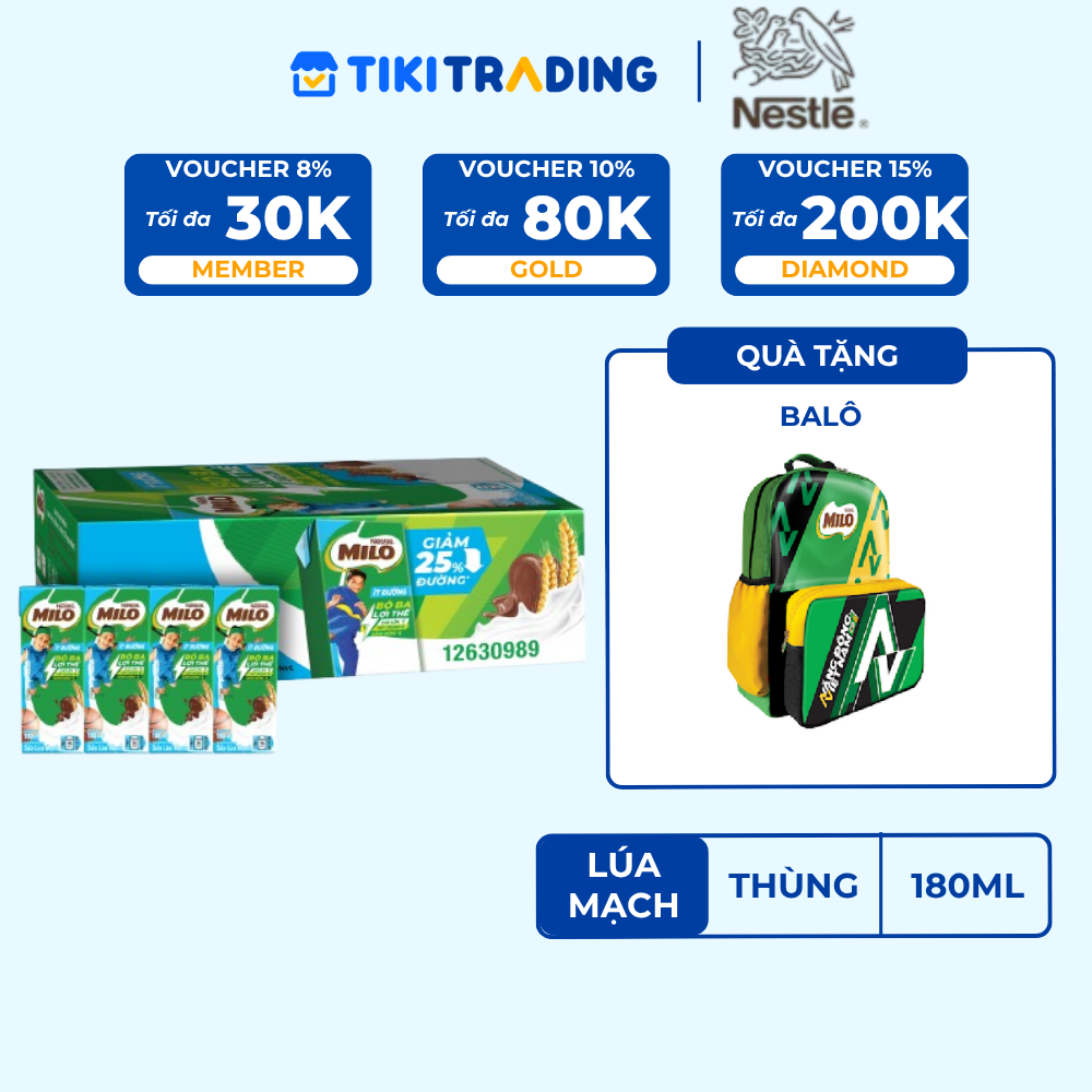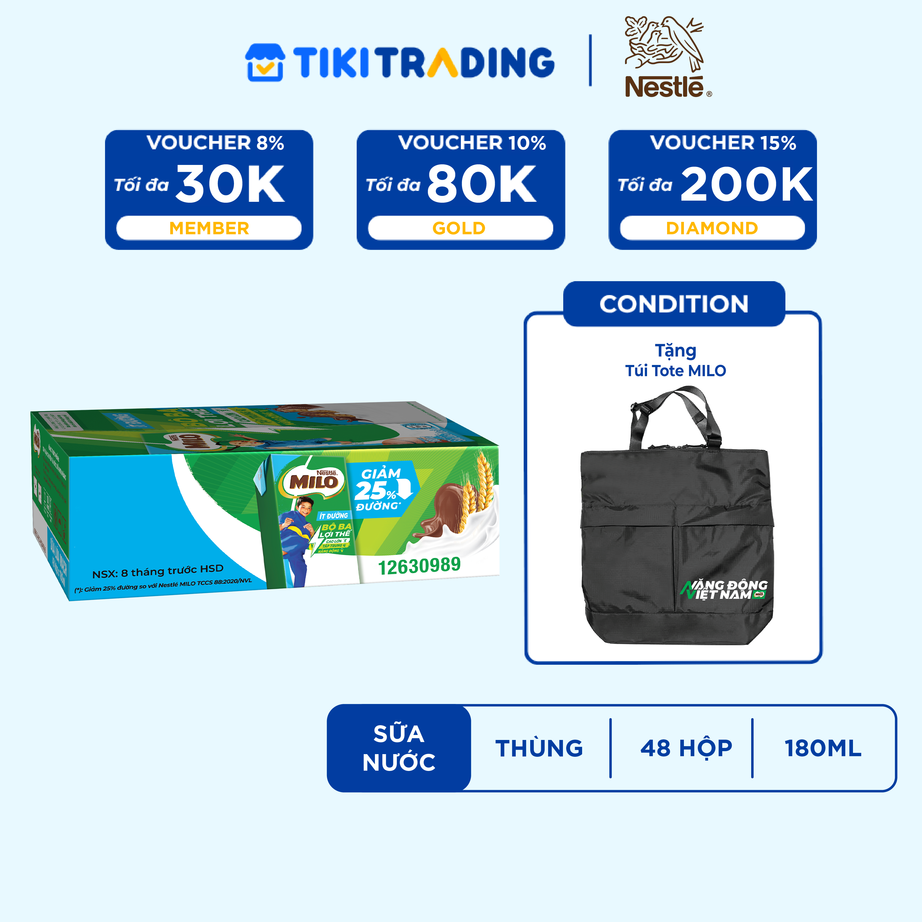 Thông số kỹ thuật [TẶNG TÚI TOTE MILO ]Thùng 48 hộp sữa lúa mạch Nestlé MILO Ít đường 180ml