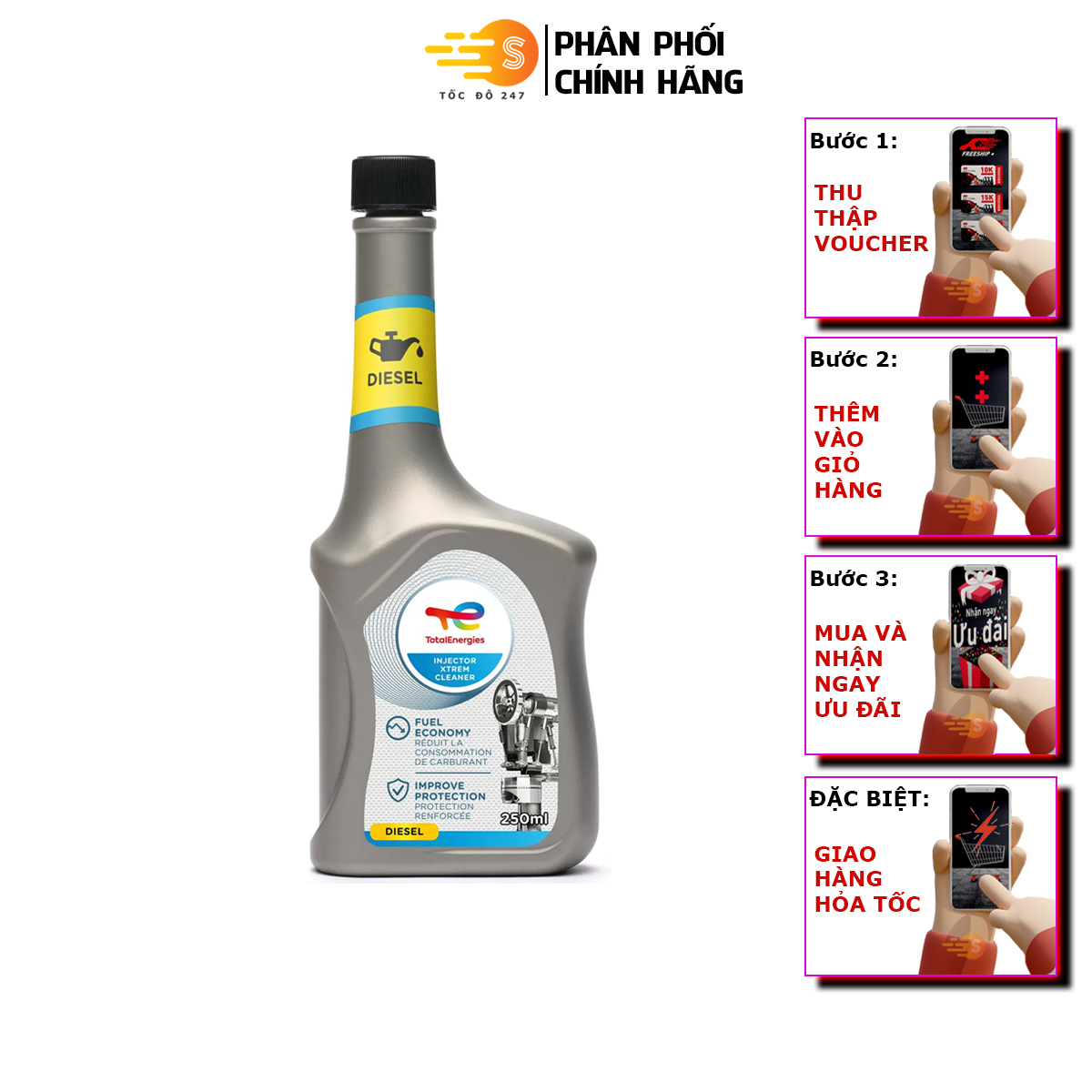 Thông số kỹ thuật Phụ gia xúc béc xăng/dầu diesel cho ô tô Total Energies TE-IS250/ID250 250ml - làm sạch hệ thống xăng, tẩy sạch carton, kim phun, đầu xi lanh, tiết kiệm nhiên liệu
