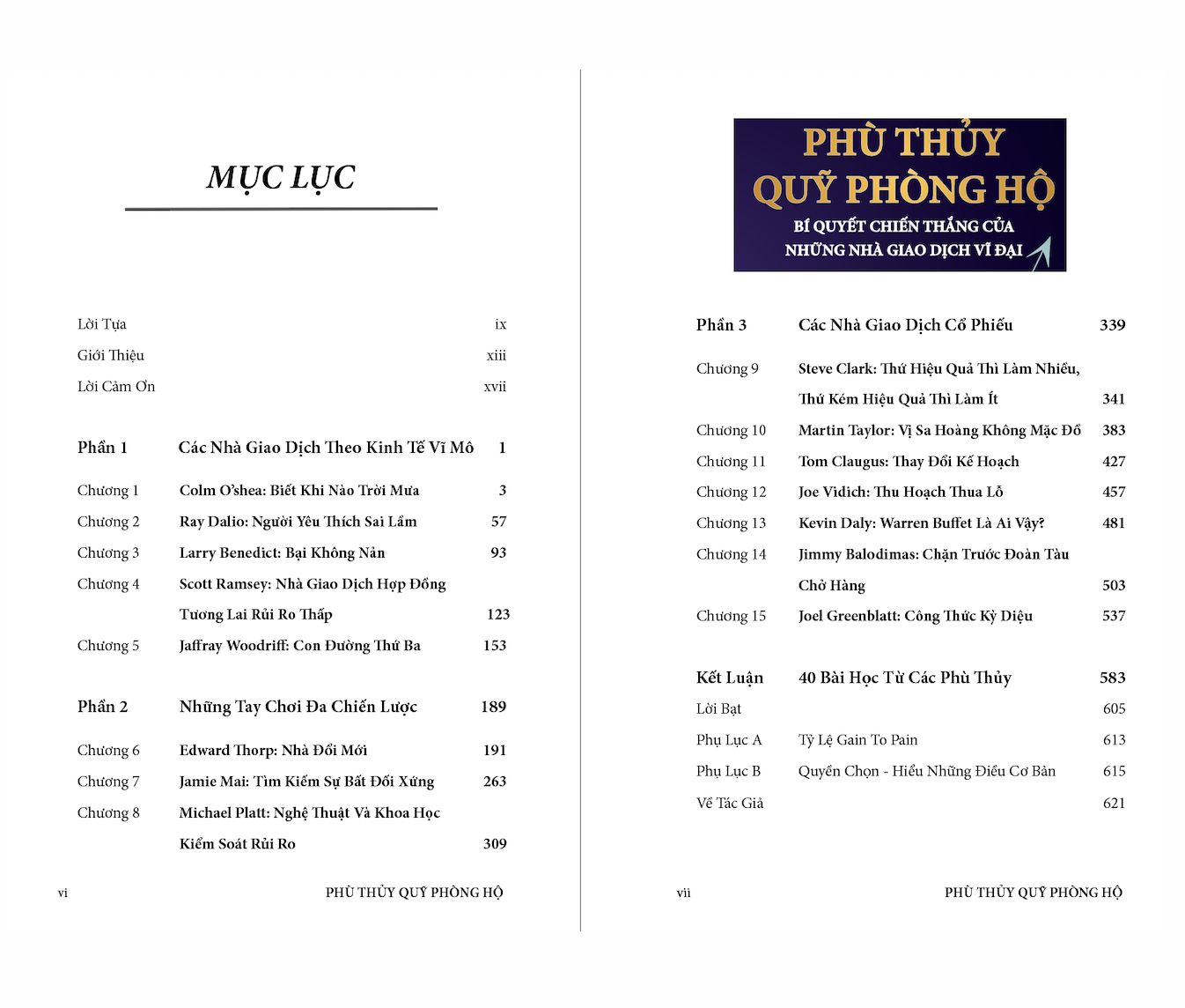Phù Thủy Quỹ Phòng Hộ không đơn thuần là một cuốn sách dạy đầu tư – đó là hành trình khám phá thế giới nội tâm và quá trình ra quyết định của những nhà giao dịch đỉnh cao. Được viết dưới dạng phỏng vấn thực tế, chân thật và sắc sảo, cuốn sách dẫn dắt người đọc đi qua các phong cách giao dịch khác nhau: từ định lượng đến vĩ mô, từ đầu tư dài hạn đến giao dịch ngắn hạn. Không giáo điều, không tô hồng, các câu chuyện trong sách mang tính đối thoại thẳng thắn – nơi thành công lẫn thất bại đều được phơi bày, giúp người đọc thấy được bản chất thật sự của việc “sống bằng giao dịch”. Với lối dẫn chuyện sinh động của Jack D. Schwager, mỗi cuộc trò chuyện là một bài học về bản lĩnh, sự kỷ luật và tư duy độc lập – những phẩm chất cần thiết để tồn tại và phát triển trong thế giới tài chính đầy biến động. Nội dung sách bao gồm 3 phần chính: