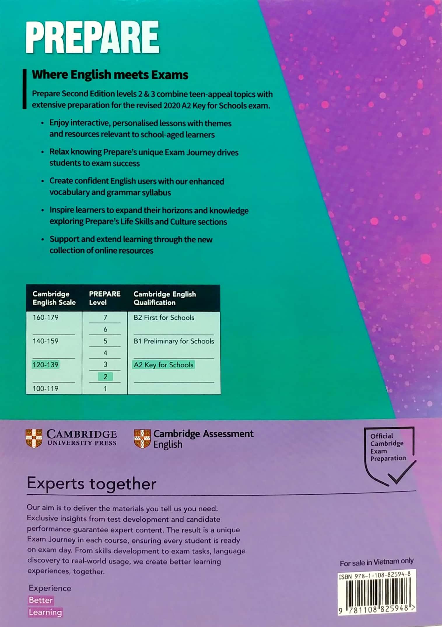 PREPARE 2nd edition Level 2 combines 'teen-appeal' topics with gradual preparation towards the revised 2020 A2 Key for Schools exam. Students will enjoy interactive, personalised lessons with themes and resources relevant to their interests. The new Life Skills approach inspires learners to expand their horizons and knowledge and includes insights from The Cambridge Framework for Life Competencies. Teachers can relax knowing every unit drives students towards exam success and that the course is creating confident English users with the enhanced vocabulary and grammar syllabus. A Student's Book and Online Workbook is also available, separately.