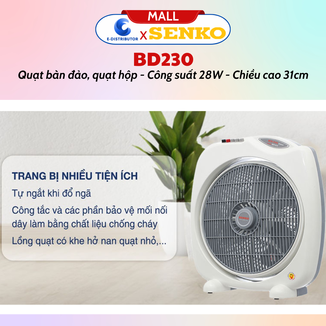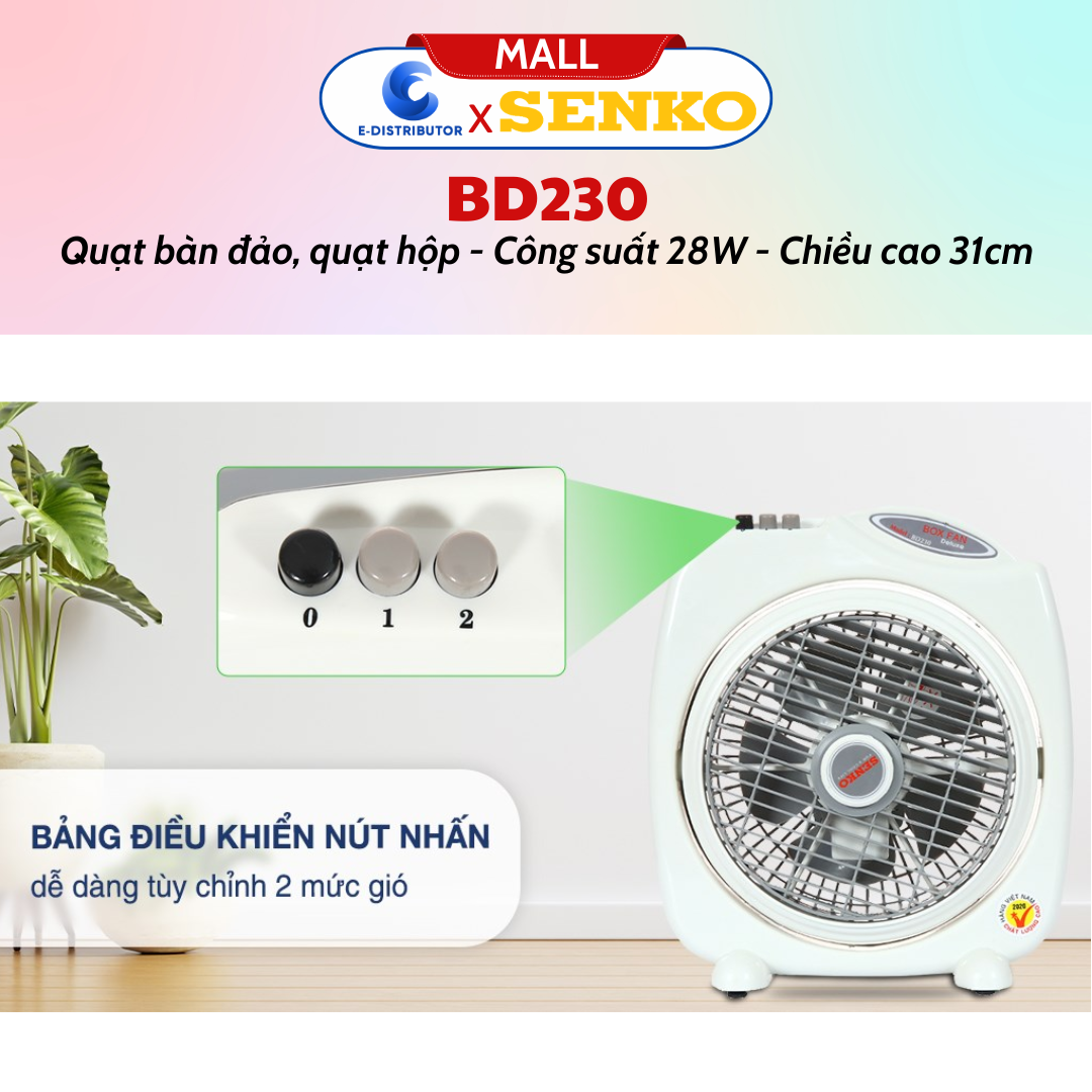 Senko là thương hiệu nổi tiếng trong ngành đồ gia dụng của Việt Nam, nổi lên như một thương hiệu mang lại uy tín về chất lượng, kỹ thuật và độ an toàn cao của sản phẩm. Quạt bàn đảo Senko BD230 (hay gọi là quạt hộp) kiểu dáng sang trọng,hiện đại với thiết kế nhỏ gọn thích hợp để trên giường hay trên bàn đều được, đây cũng là một giải pháp hợp lý để xua tan đi cái nóng của những ngày hè sắp tới, bây giờ chúng ta sẽ đến với những thông tin chi tiết về sản phẩm này nhé.