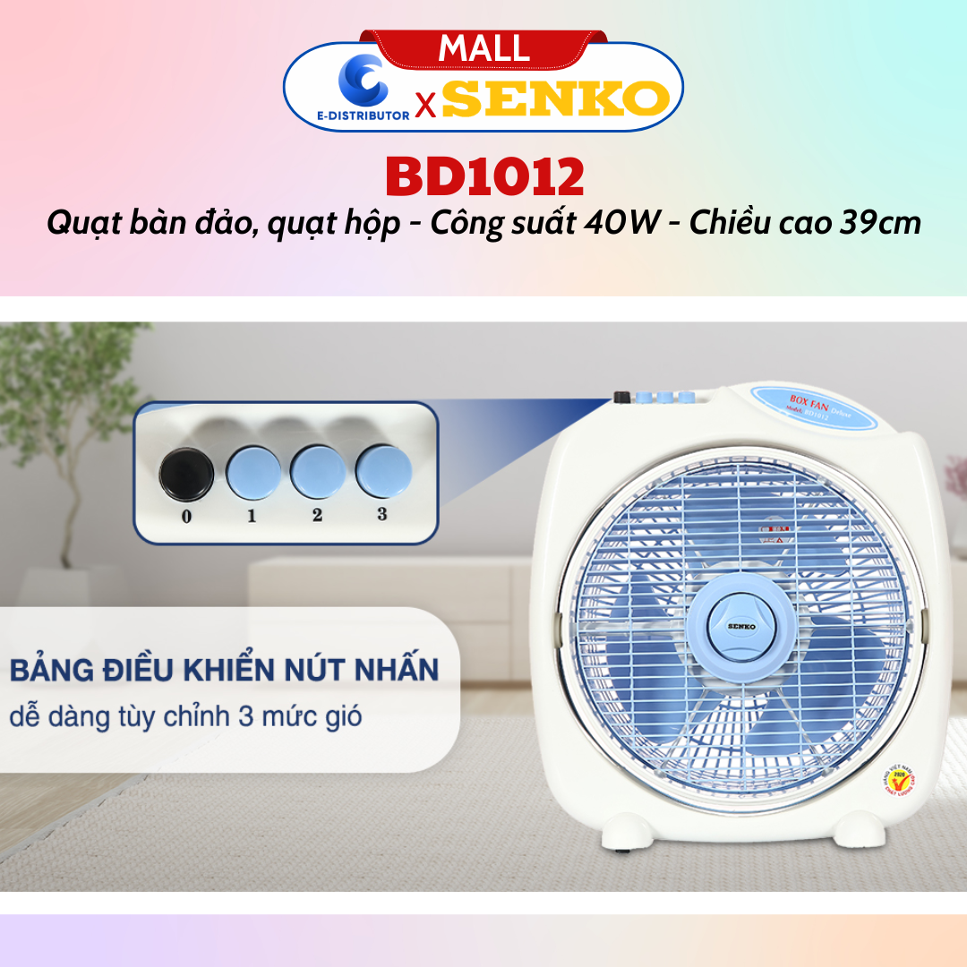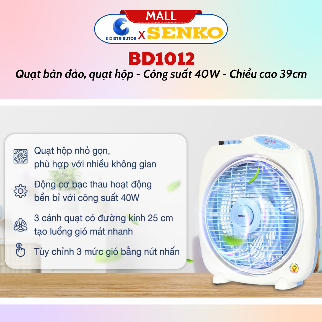 Model: BD1012 Màu sắc: Kem môn Nhà sản xuất: Senko Xuất xứ: Việt Nam Thời gian bảo hành: 24 tháng Địa điểm bảo hành: Hãng senko Loại quạt điện: Quạt bàn Công suất: 40W Đường kính cánh quạt: 30cm Số cánh quạt: 3 Chất liệu cánh quạt: Nhựa Tốc độ gió: 3 tốc độ gió Chức năng hẹn giờ: Không Điều khiển từ xa: Không ----------------------------------------------------------------