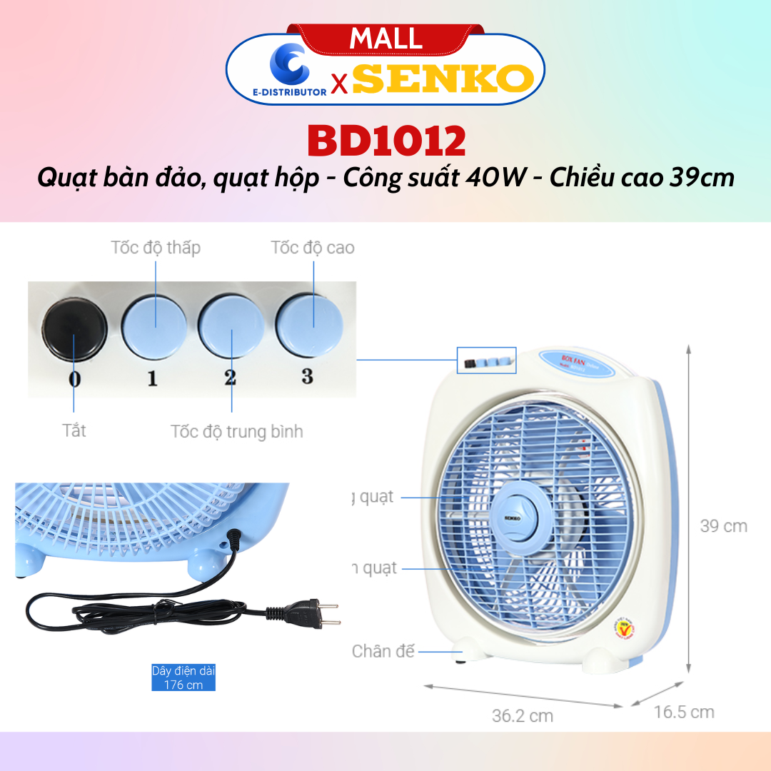 Thông số kỹ thuật Quạt Bàn Đảo 3 Tấc Senko BD1012 cao cấp - Màu Ngẫu Nhiên - Hàng chính hãng