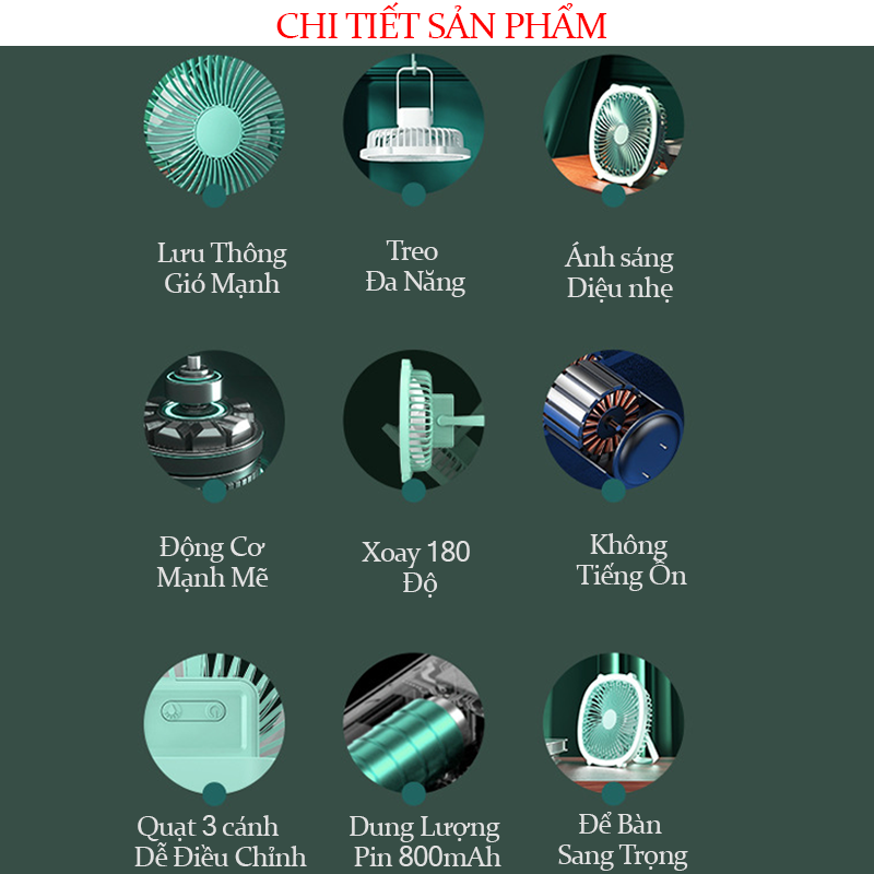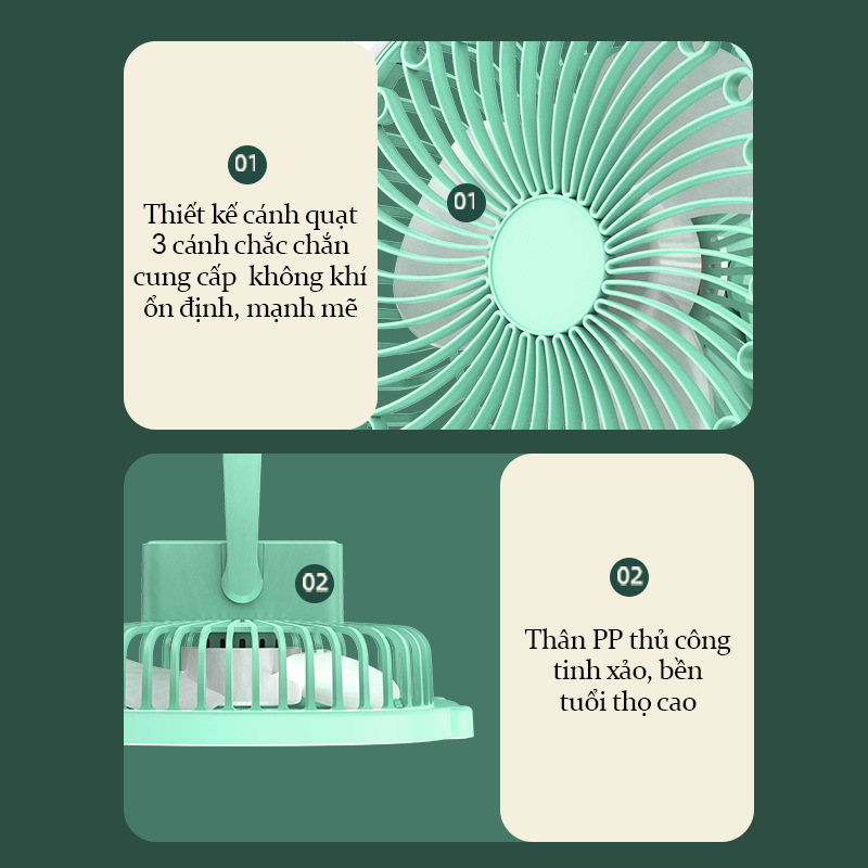 Quạt sạc đa năng có 03 cấp độ gió giúp bạn chủ động được tốc độ gió khi cần sử dụng: nhẹ dịu hoặc gió mạnh. Sản phẩm được làm bằng chất liệu nhựa abs cao cấp, có độ bền cao và sử dụng mô tơ không chổi than yên tĩnh, không nóng máy, đảm bảo an toàn cho người dùng. Quạt có tích hợp đèn, có thể thay thế đèn ngủ sử dụng vô cùng tiện lợi.