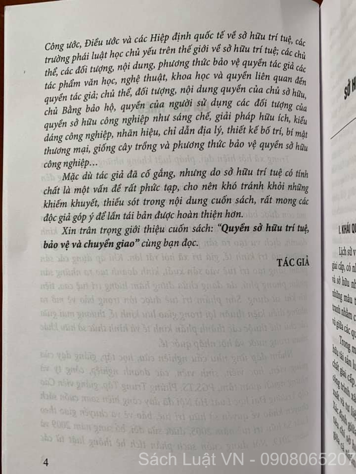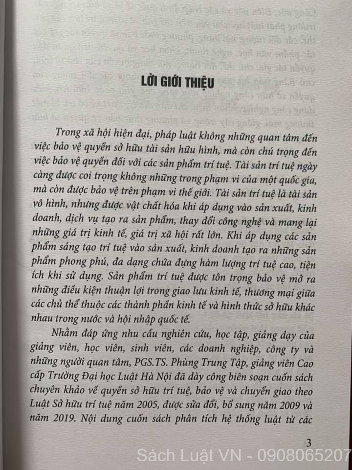 Nhằm đáp ứng nhu cầu nghiên cứu, học tập, giảng dạy của giảng viên, học viên, sinh viên, các doanh nghiệp, công ty và những người quan tâm, PGS.TS. Phùng Trung Tập, giảng viên Cao cấp Trường Đại học Luật Hà Nội đã dày công biên soạn cuốn sách chuyên khảo về quyền sở hữu trí tuệ, bảo vệ và chuyển giao theo Luật Sở hữu trí tuệ năm 2005, được sửa đổi, bổ sung năm 2009 và năm 2019. Nội dung cuốn sách phân tích hệ thống luật từ các Công thức. Điều nước và các Hiệp định quốc tế về sở hữu trí tuệ, các trường phái luật học chủ yếu trên thế giới về sở hữu trí tuệ; các chủ thể các đối tượng, nội dung, phương thức bảo vệ quyền tác giả các tác phẩm văn học, nghệ thuật, khoa học và quyền liên quan đến quyền tác giả; chủ thể, đối tượng, nội dung quyền của chủ sở hữu, chủ Bằng bảo hộ, quyền của người sử dụng các đối tượng của quyền sở hữu công nghiệp như sáng chế, giải pháp hữu ích, kiểu dáng công nghiệp, nhãn hiệu, chỉ dẫn địa lý, thiết kế bố trí, bí mật thương mại, giống cây trồng và phương thức bảo vệ quyền sở hữu công nghiệp...