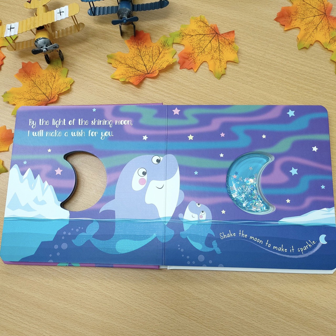 Shake the book to create a colourful cascade of glitter and foil shapes inside the moon, which is secured to the inside of the book so you can make the moon shake, shimmer and sparkle on each page. The gentle, rhyming story, swirling glitter and foil stars and cute illustrations will calm and reassure little ones before they go to sleep.
