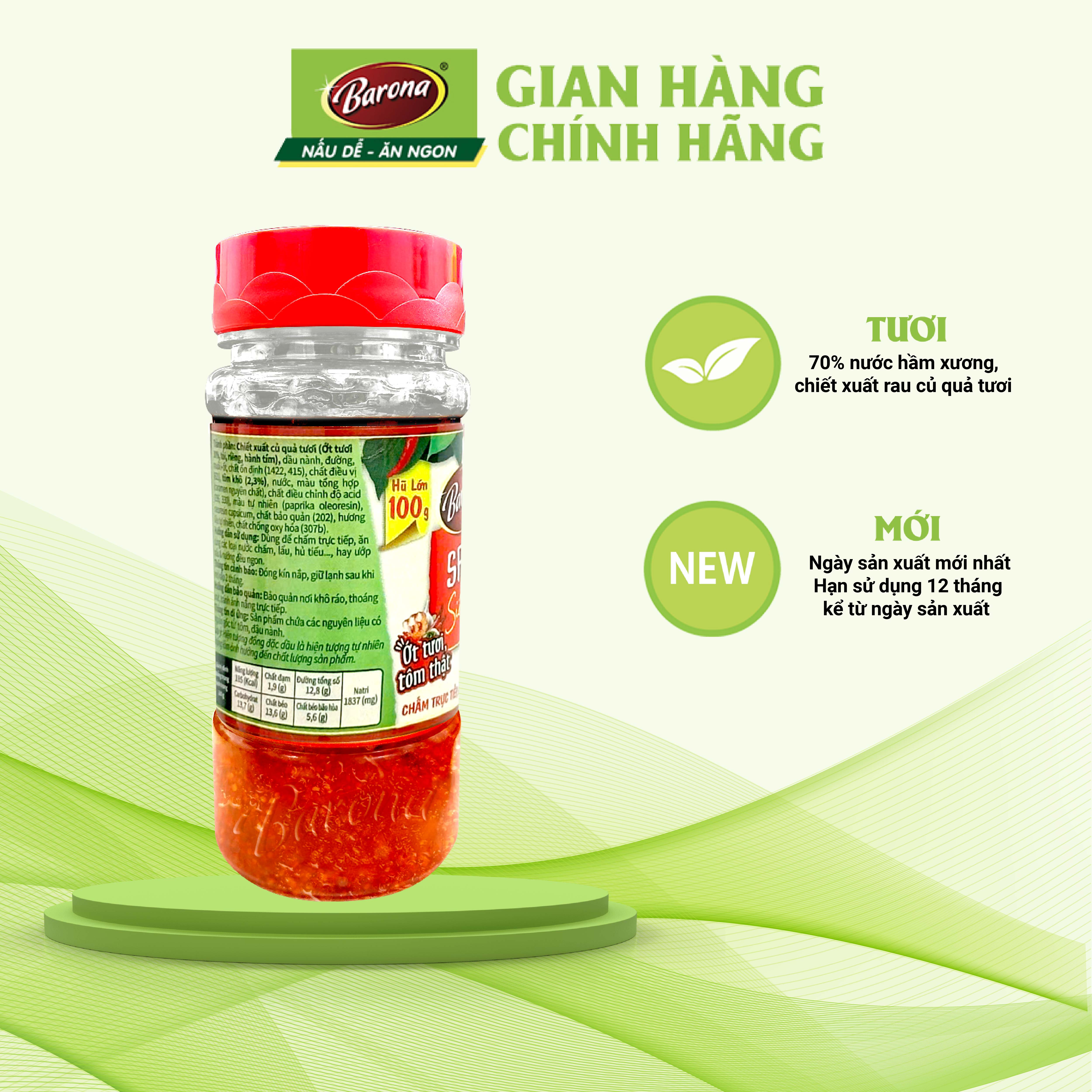 Satế tôm Siêu ngon Barona làm từ ớt tươi được chọn lọc kỹ lưỡng hoà quyện cùng vị tôm khô & tỏi tươi tạo nên hương vị thơm ngon hấp dẫn. Đặc biệt Satế tôm siêu ngon giúp tăng khẩu vị và màu sắc các món ăn kèm như bún, lẩu, hủ tiếu hay dùng để ướp các món nướng đều rất Sản phẩm tiết kiệm hơn với hủ lớn 110g là sự lựa chọn hoàn hảo cho món ngon của bạn.
