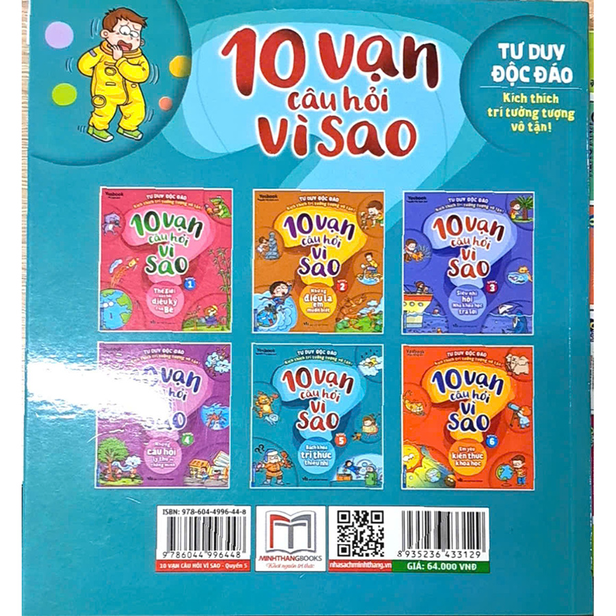- Bộ sách "10 vạn câu hỏi vì sao" tuyển chọn 270 câu hỏi mà trẻ em tò mò nhất với tiêu chí thú vị, thần kì, mới mẻ, đặc sắc. Trong cuốn sách có những lời giải thích khoa học, những hình ảnh minh họa đẹp, để trẻ tiếp nhận kiến thức khoa học với tâm trạng thoải mái, vui vẻ nhất. Trong mỗi cột câu hỏi còn thiết kế ô riêng biệt để trẻ trình bày những điều mình hiểu về vấn đề đó. Đó có thể là những câu trả lời ngộ nghĩnh, trí tưởng tượng bay bổng, giúp chúng ta thấy được sự ngây thơ đáng yêu của trẻ.