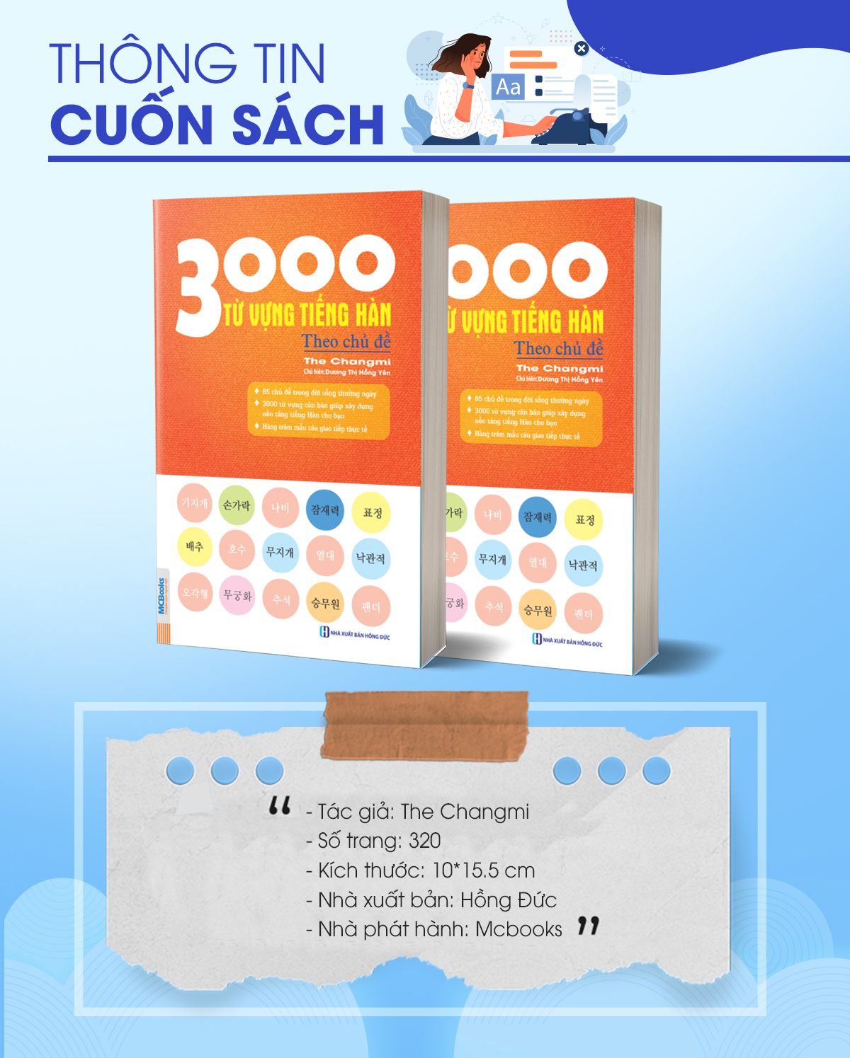 “3000 từ vựng tiếng Hàn theo chủ đề” là cuốn sách nhỏ gọn, tiện dụng mà các bạn có thể mang theo bên mình và học trong những thời gian rảnh rỗi hàng ngày mà vẫn nắm chắc kiến thức.
