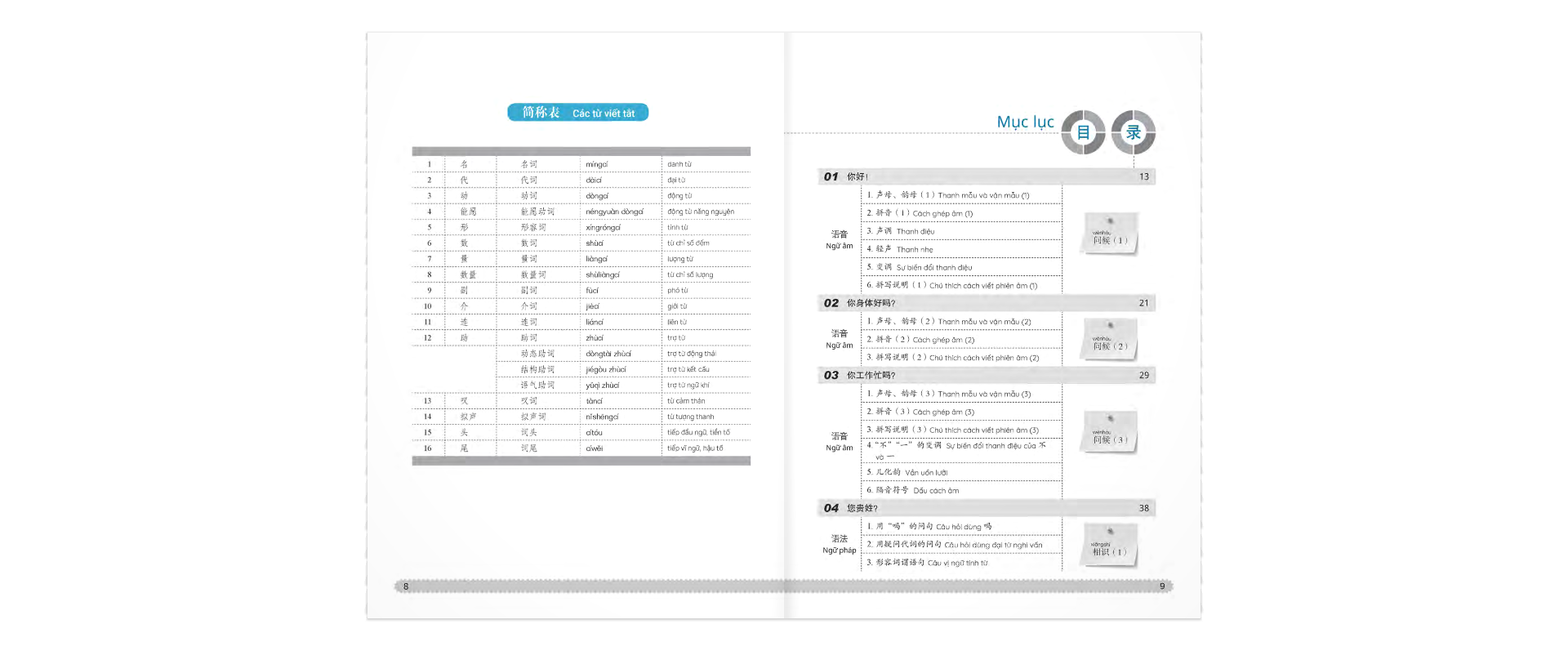 Giáo trình gồm tổng cộng 40 bài học và 8 bài ôn tập. Các bài học cung cấp gần 30 nội dung liên quan đến kỹ năng giao tiếp (chào hỏi, làm quen…), khoảng 800 từ mới và các điểm ngữ pháp cơ bản trong tiếng Trung Quốc. Mỗi bài học có sáu phần: câu, đối thoại, thay thế và mở rộng, từ mới, ngữ pháp, bài tập.