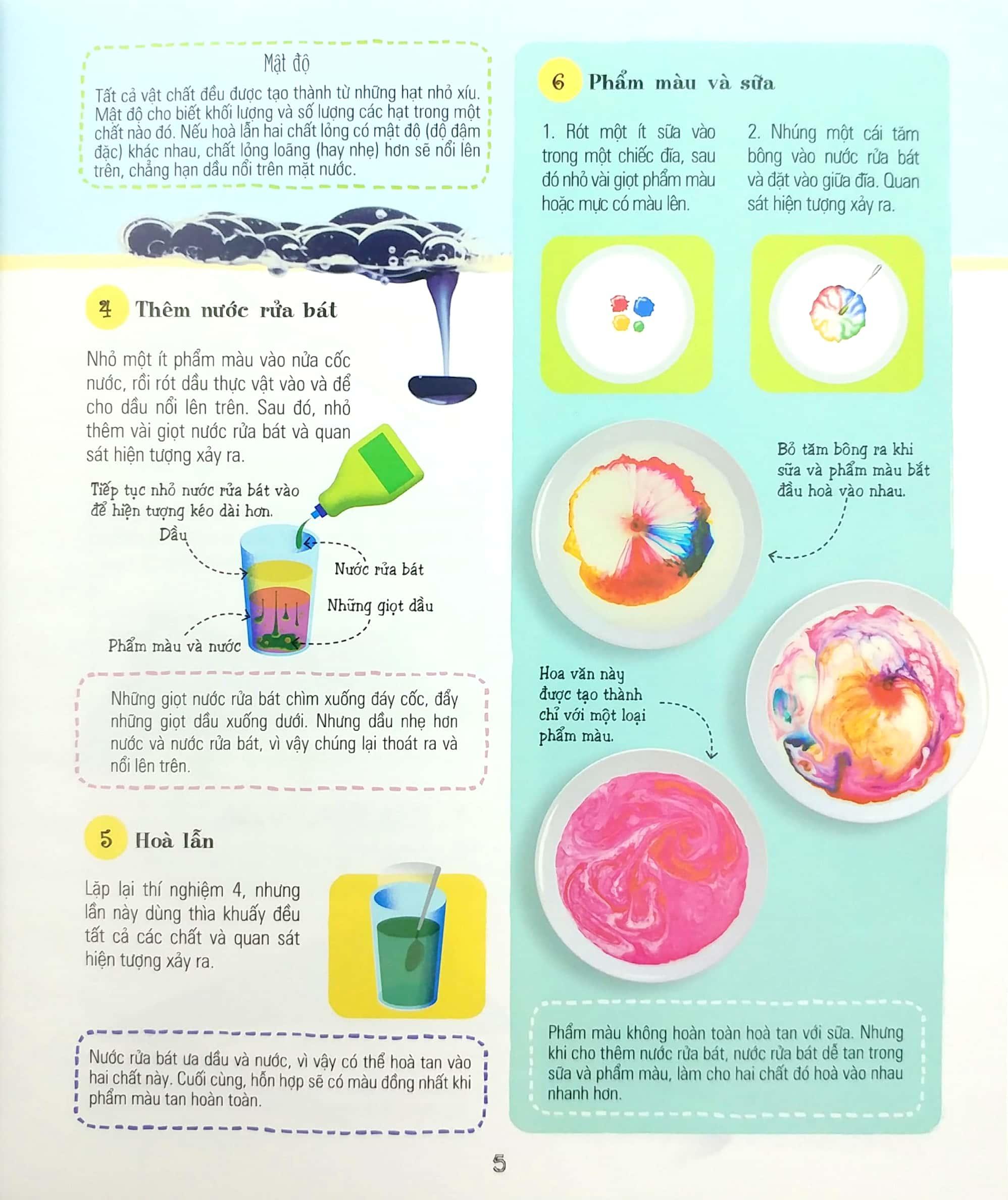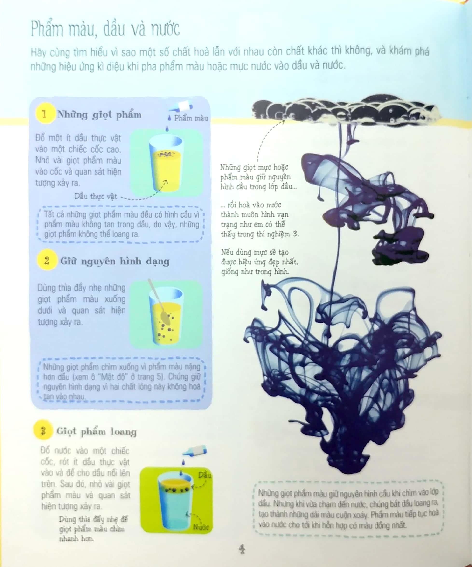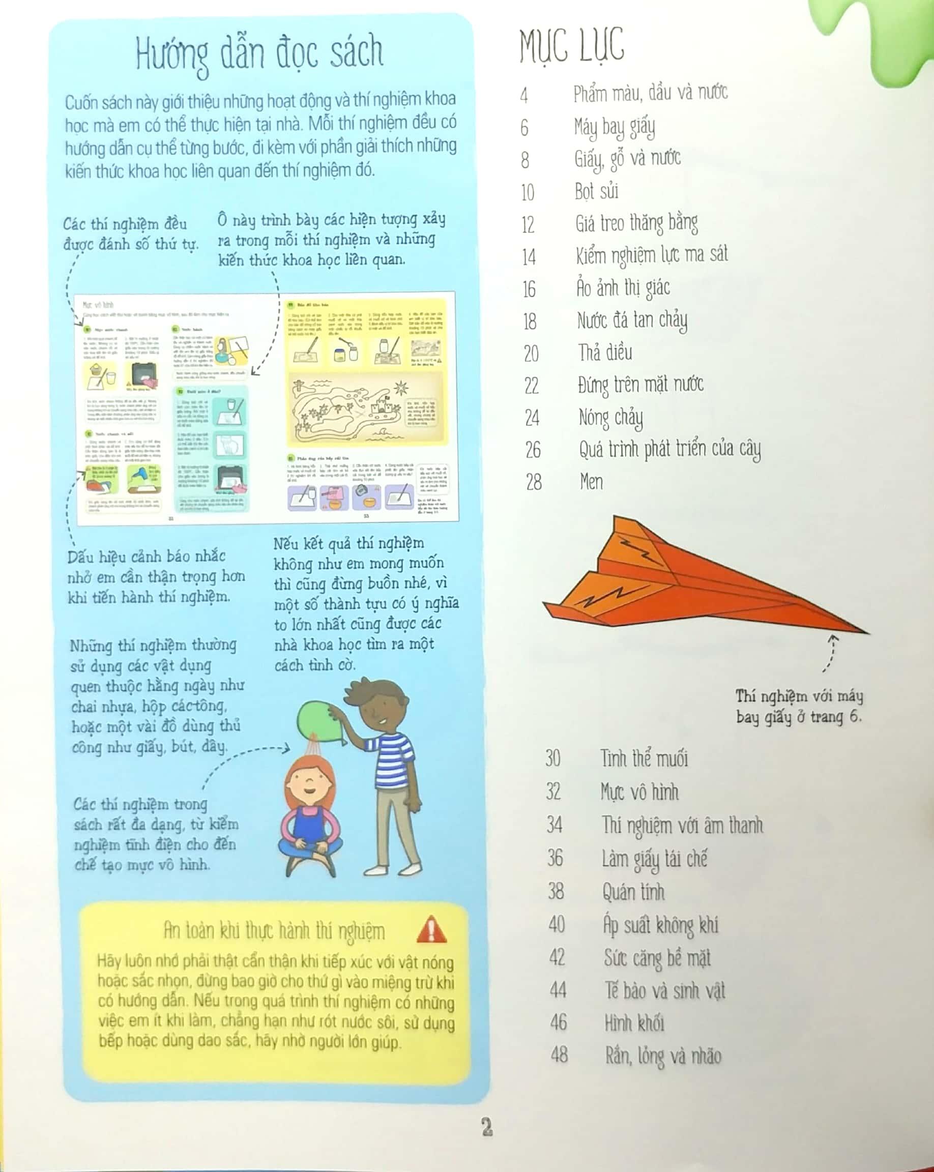 Các thí nghiệm đều được đánh số thứ tự. Mỗi thí nghiệm dều có các ô trình bày hiện tượng xảy ra và những kiến thức khoa học xung quanh hiện tượng đó. Những thí nghiệm thường sử dụng các vật dụng quen thuộc hằng ngày như chai nhựa, hộp các-tông, hoặc một vài đồ dùng thủ công như giấy, bút, dây. Các thí nghiệm trong sách rất đa dạng, từ kiểm nghiệm tính điện cho đến chế tạo mực vô hình. Nhưng nếu kết quả thí nghiệm không như em mong muốn thì cũng đừng buồn nhé, vì một số thành tựu có ý nghĩa to lớn nhất cũng được các nhà khoa học tìm ra một cách tình cờ thôi.