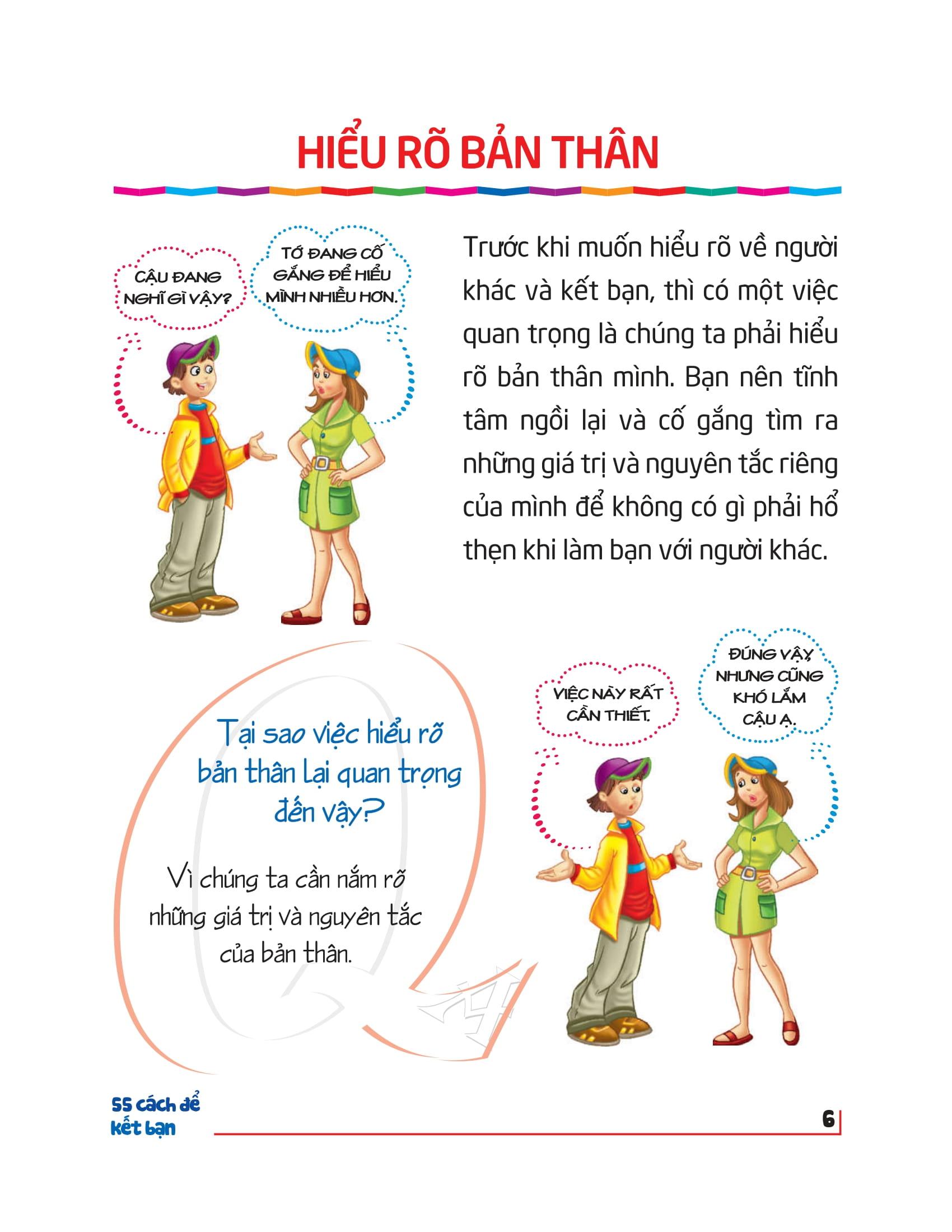 Cuốn sách nhỏ này đưa ra cho bạn 55 phương thức kết bạn, mỗi phương thức đều đi kèm chú thích và phần đối thoại minh hoạ, mang đến cho người đọc những gợi ý thú vị và hiệu quả.