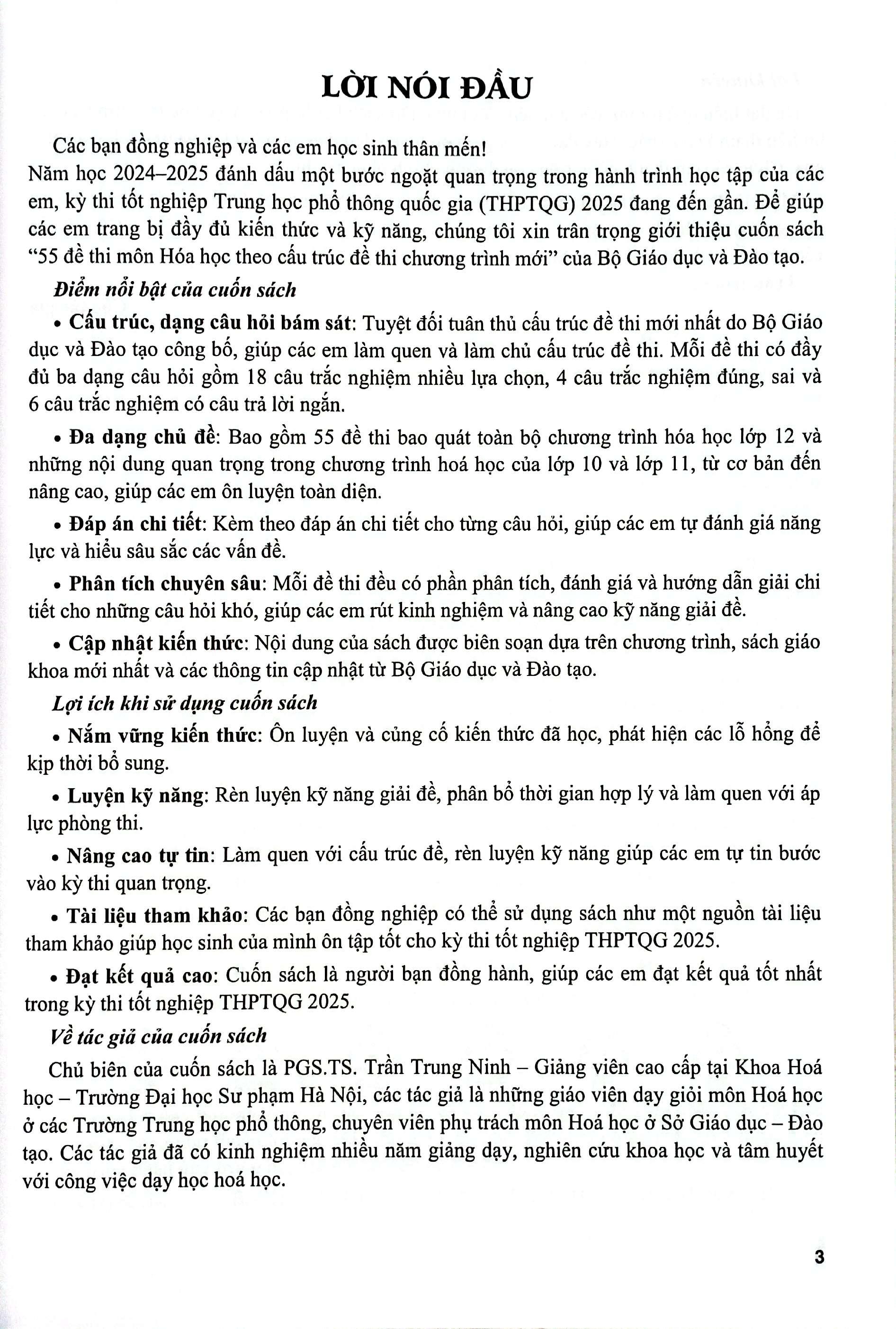 Năm học 2024–2025 đánh dấu một bước ngoặt quan trọng trong hành trình học tập của các em, kỳ thi tốt nghiệp Trung học phổ thông quốc gia (THPTQG) 2025 đang đến gần. Để giúp các em trang bị đầy đủ kiến thức và kỹ năng, chúng tôi xin trân trọng giới thiệu cuốn sách “55 đề thi môn Hóa học theo cấu trúc đề thi chương trình mới” của Bộ Giáo dục và Đào tạo.