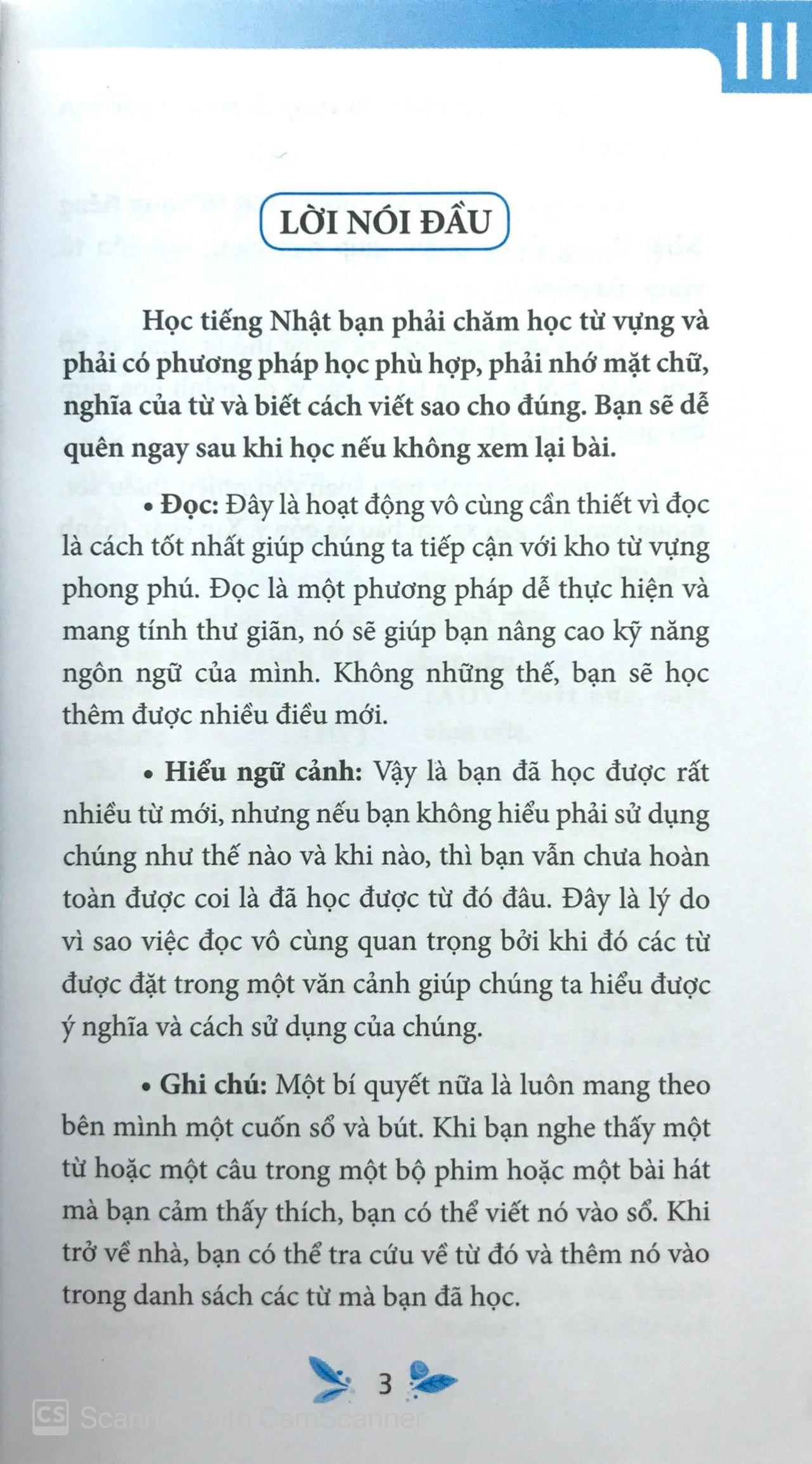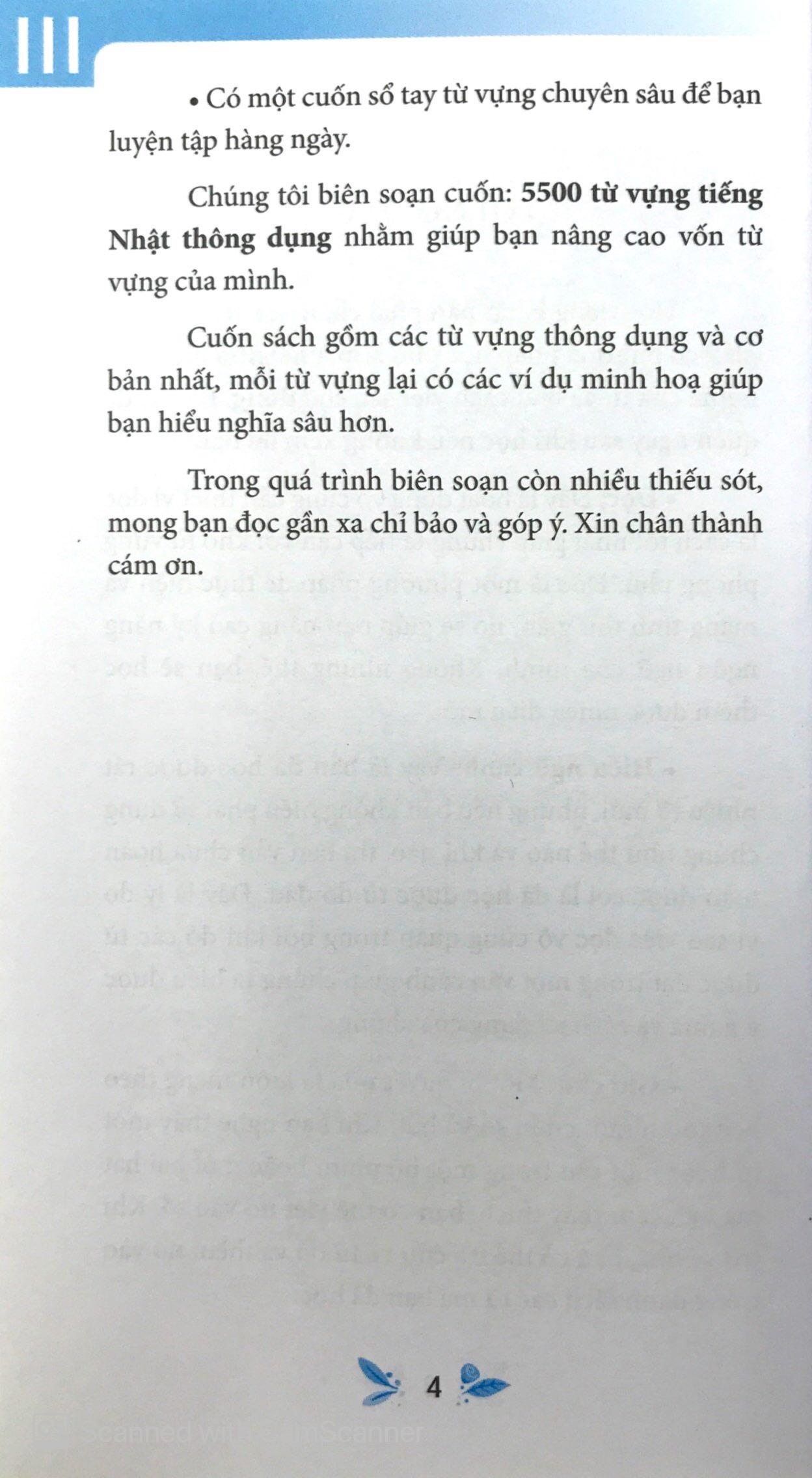 Chúng tôi biên soạn cuốn: 5500 từ vựng tiếng Nhật thông dụng nhằm giúp bạn nâng cao vốn từ vựng của mình. Cuốn sách gồm các từ vựng thông dụng và cơ bản nhất, mỗi từ vựng lại có các ví dụ minh hoạ giúp bạn hiểu nghĩa sâu hơn.