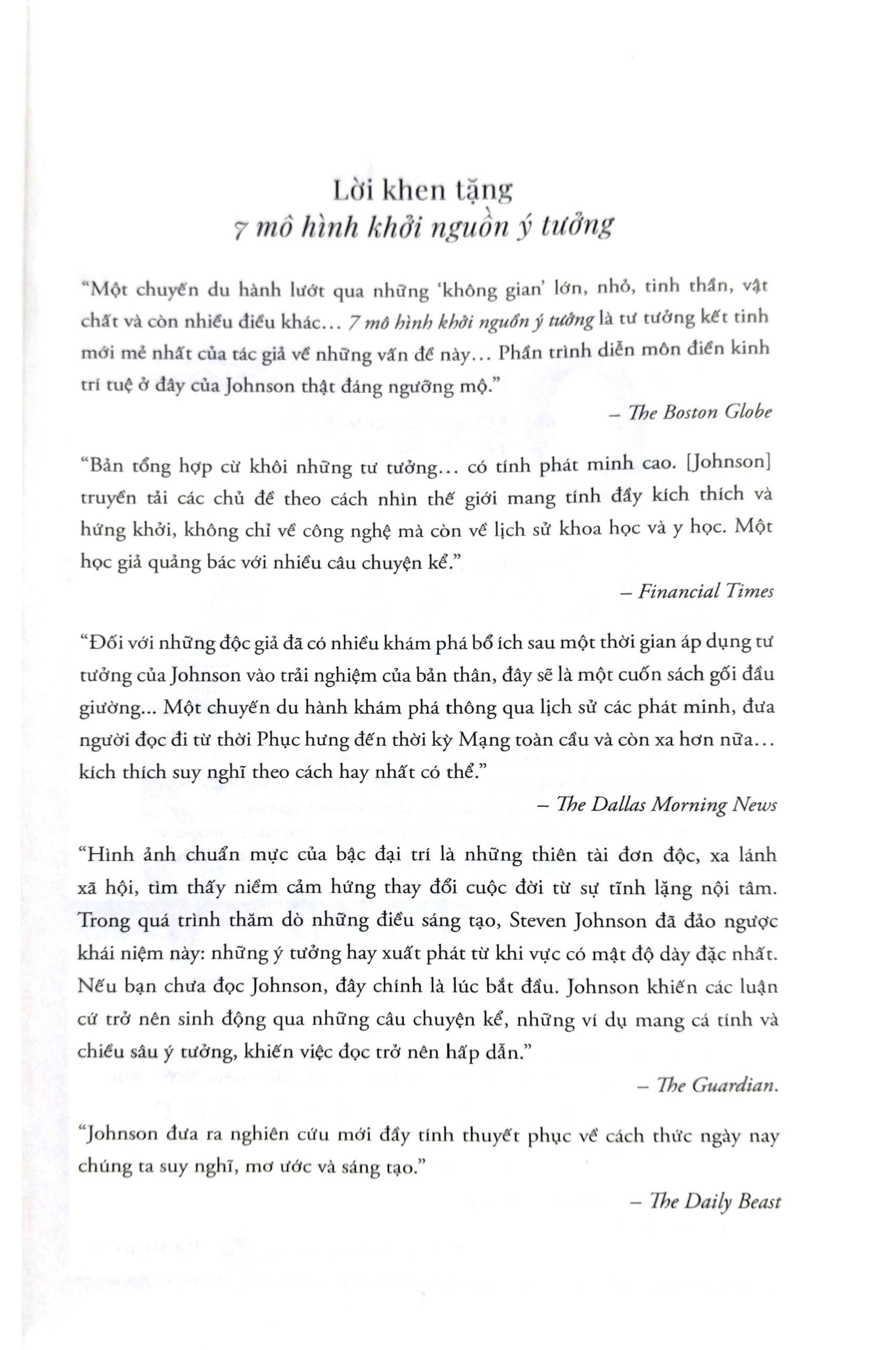 “Steven Johnson chính là Darwin trong công nghệ. Thông qua các quan sát và cách nhìn nhận thú vị, anh đã khai sáng chúng ta về nguồn gốc các ý tưởng. Làm thể nào để tạo ra những môi trường và mạng lưới thúc đẩy các ý tưởng mới? Johnson đã khám phá ra các kiểu hình giúp trả lời câu hỏi phản biện này.” – Walter Isaacson, tác giả cuốn sách bán chạy nhất Einstein – Cuộc Đời Và Vũ Trụ