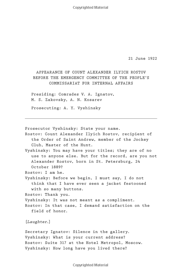 On 21 June 1922, Count Alexander Rostov - recipient of the Order of Saint Andrew, member of the Jockey Club, Master of the Hunt - is escorted out of the Kremlin, across Red Square and through the elegant revolving doors of the Hotel Metropol.