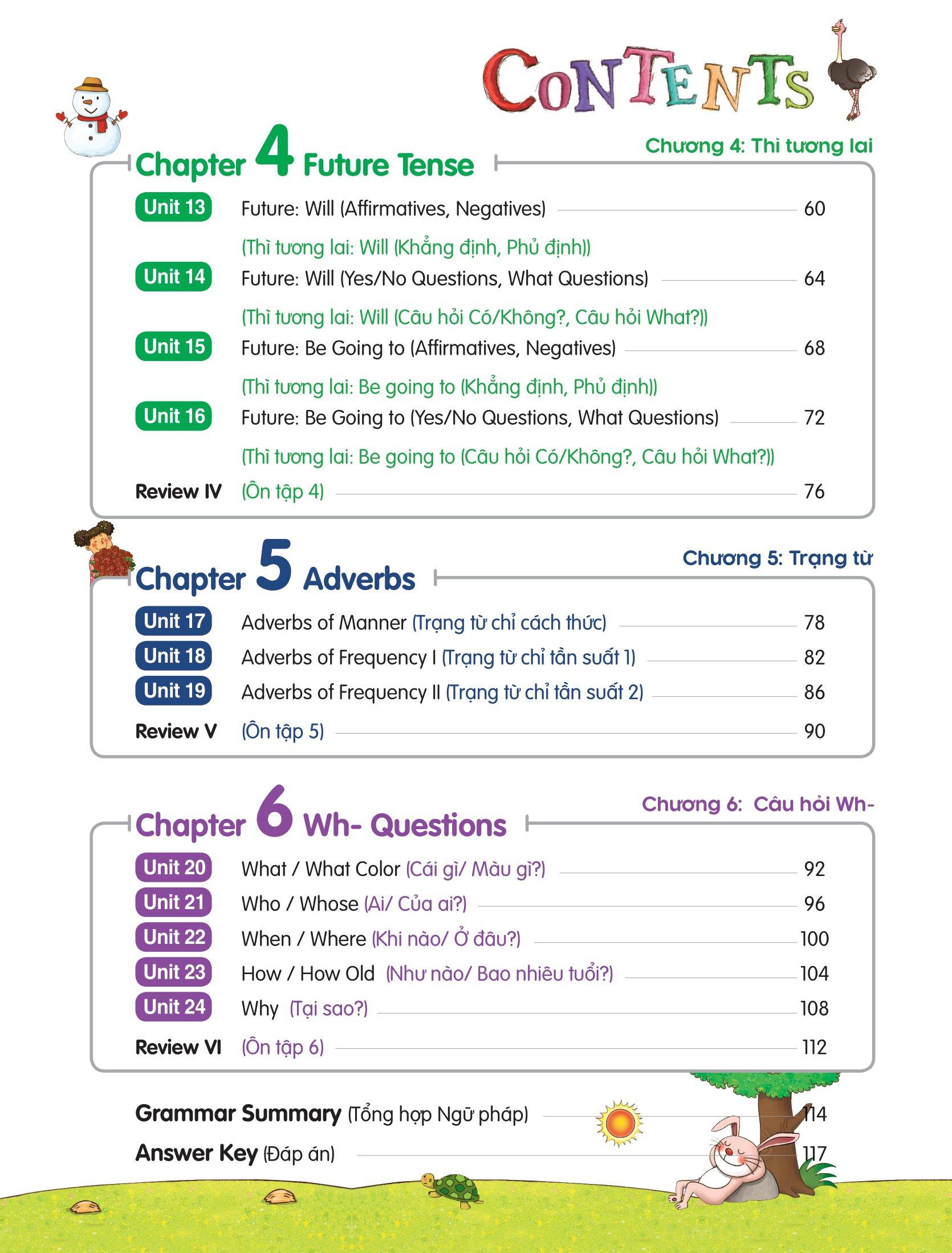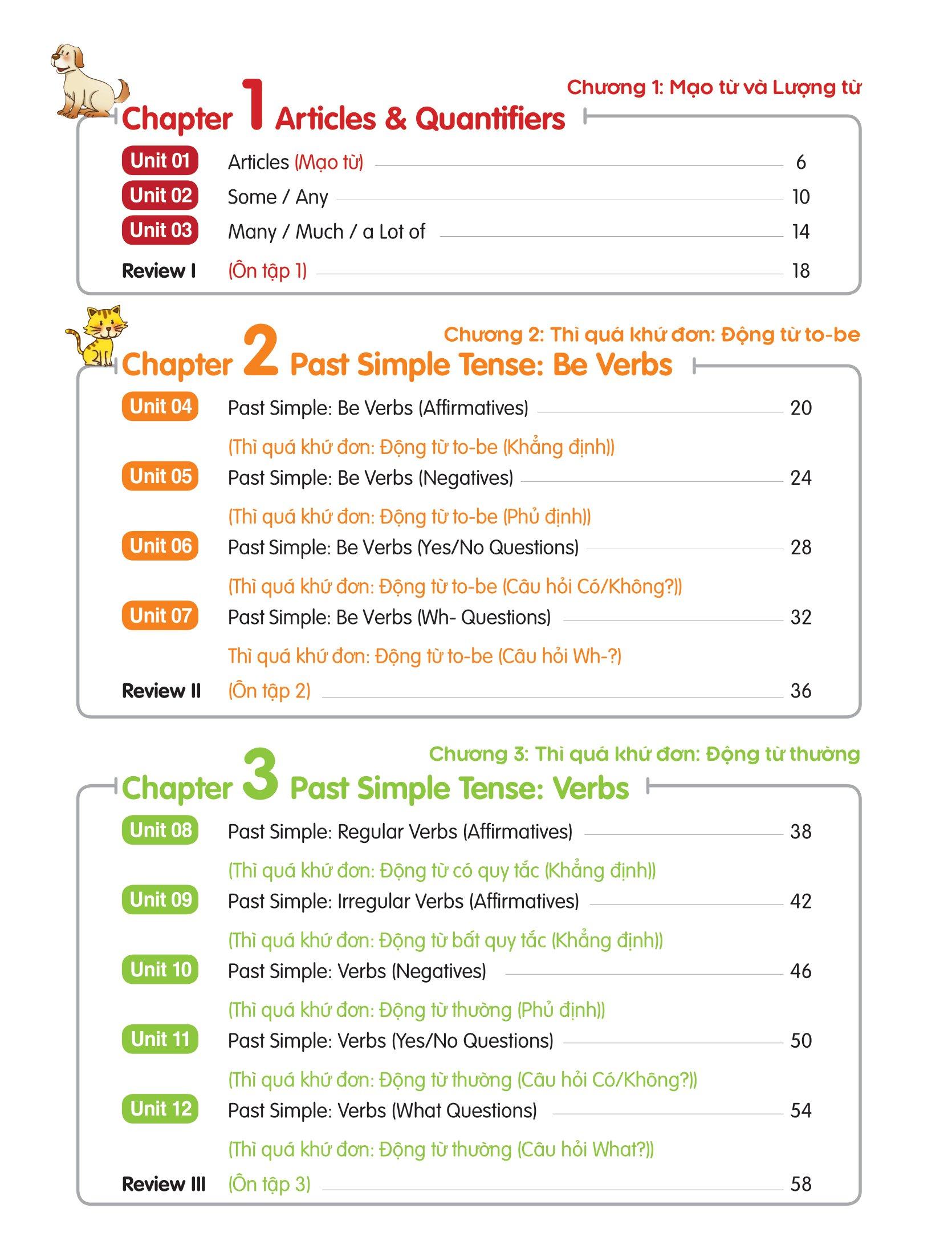 1. Sách gồm 6 chương với 24 Unit, tổng hợp tất cả những chủ đề ngữ pháp hay nhất trong chương trình lớp 4 như: Danh từ & Mạo từ, Đại từ, động từ To-be, …
