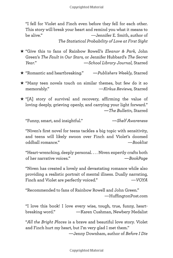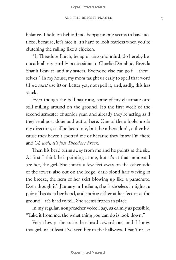 Theodore Finch is fascinated by death, and he constantly thinks of ways he might kill himself. But each time, something good, no matter how small, stops him.