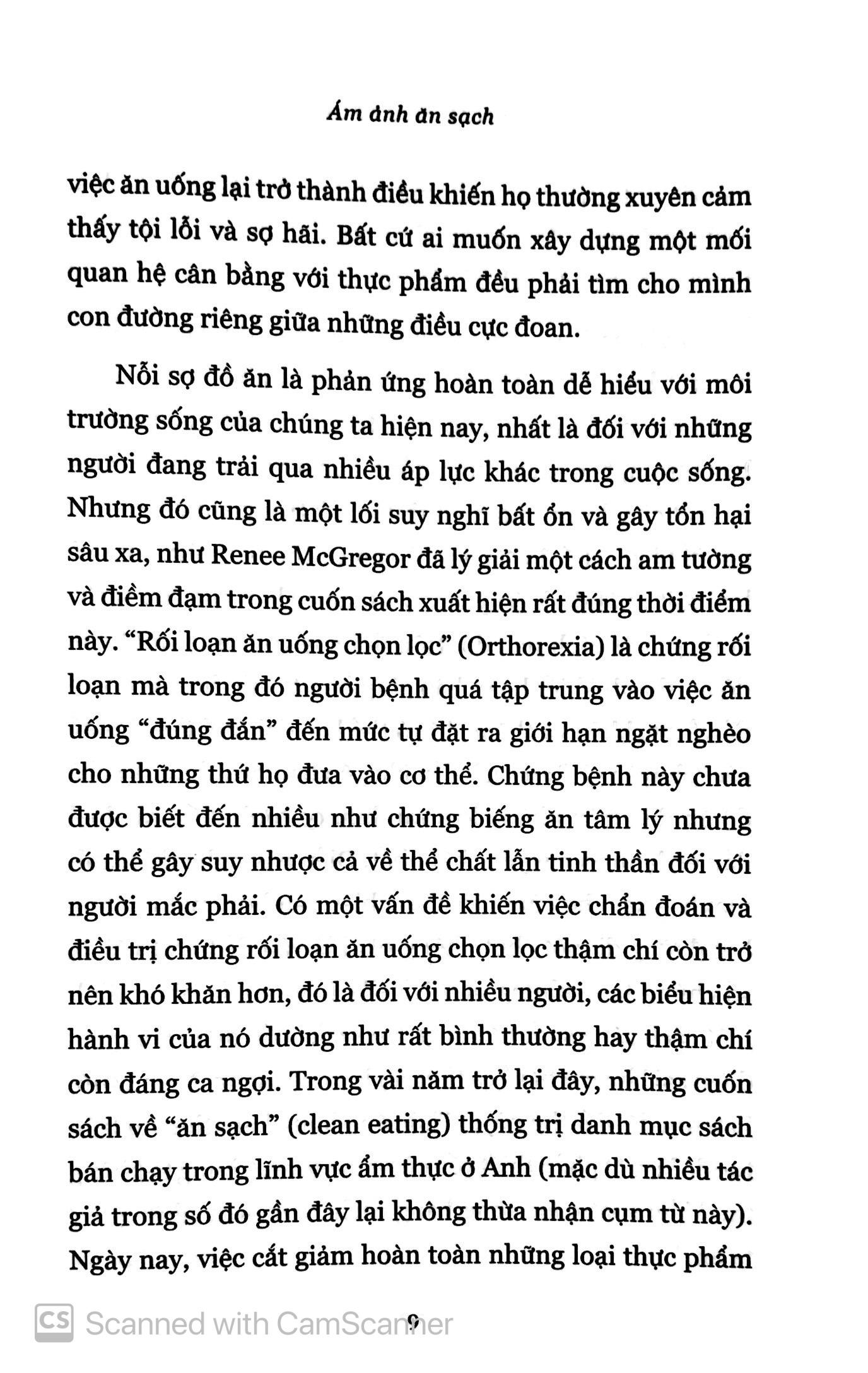 Nỗi sợ đồ ăn là phản ứng hoàn toàn dễ hiểu với môi trường sống của chúng ta hiện nay, nhất là đối với những người đang trải qua nhiều áp lực khác trong cuộc sống. Nhưng đó cũng là một lối suy nghĩ bất ổn và gây tổn hại sâu xa, như Renee McGregor đã lý giải một cách am tường và điềm đạm trong cuốn sách xuất hiện rất đúng thời điểm này. “Rối loạn ăn uống chọn lọc” (Orthorexia) là chứng rối loạn mà trong đó người bệnh quá tập trung vào việc ăn uống “đúng đắn” đến mức tự đặt ra giới hạn ngặt nghèo cho những thứ họ đưa vào cơ thể. Chứng bệnh này chưa được biết đến nhiều như chứng biếng ăn tâm lý nhưng có thể gây suy nhược cả về thể chất lẫn tinh thần đối với người mắc phải. Có một vấn đề khiến việc chẩn đoán và điều trị chứng rối loạn ăn uống chọn lọc thậm chí còn trở nên khó khăn hơn, đó là đối với nhiều người, các biểu hiện hành vi của nó dường như rất bình thường hay thậm chí còn đáng ca ngợi. Trong vài năm trở lại đây, những cuốn sách về “ăn sạch” (clean eating) thống trị danh mục sách bán chạy trong lĩnh vực ẩm thực ở Anh (mặc dù nhiều tác giả trong số đó gần đây lại không thừa nhận cụm từ này). Ngày nay, việc cắt giảm hoàn toàn những loại thực phẩm nào đó – từ bánh mỳ, đường, gluten đến tất cả các loại carbohydrate – để trở nên khỏe mạnh hơn đã gần như trở thành một trào lưu chính thống.