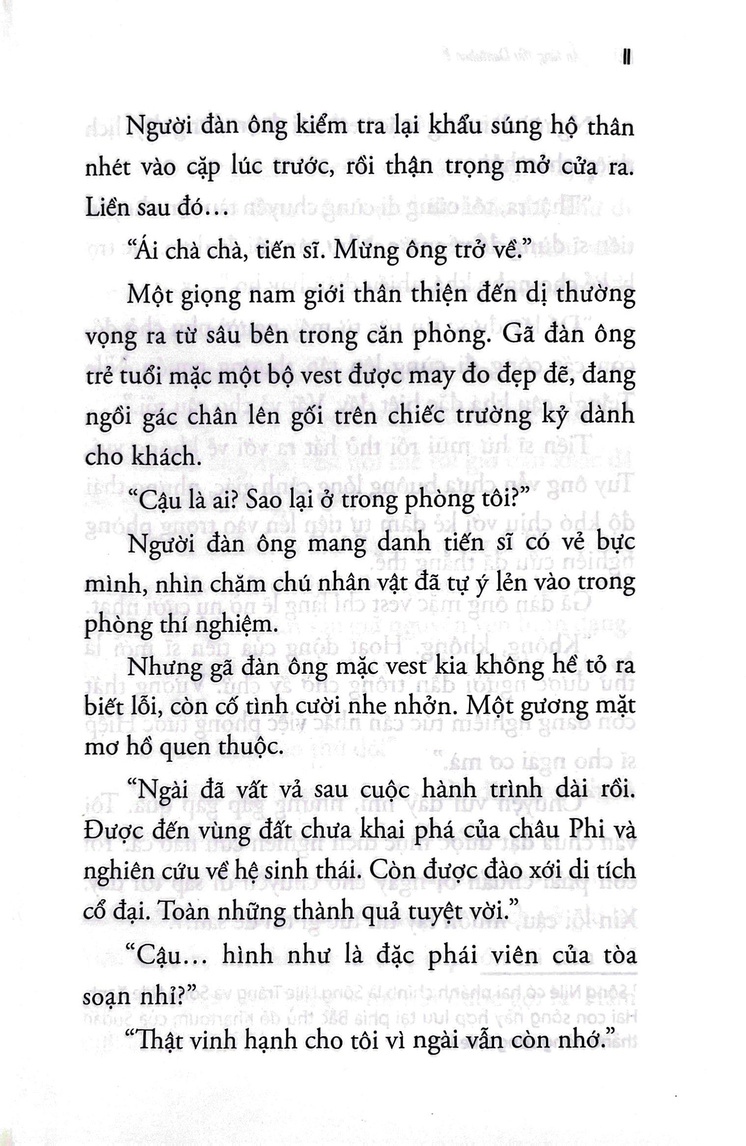 “Chúng tôi mới phải cảm tạ chứ. Quý vị còn mang theo cuốn sổ ghi chép Saharalfa mà tôi cứ ngỡ đã biệt tăm và không còn được thấy lại nữa chứ.”