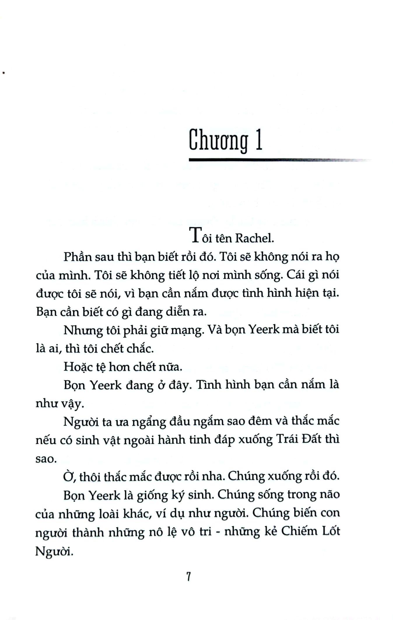 Tôi tên Rachel. Và, bạn biết rồi đó, tôi sẽ không nói ra họ của mình. Tôi sẽ không tiết lộ nơi mình sống. Cái gì nói được tôi sẽ nói, vì bạn cần nắm được tình hình hiện tại. Nhưng tôi phải sống. Và bọn Yeerk mà biết tôi là ai, thì tôi chết chắc.