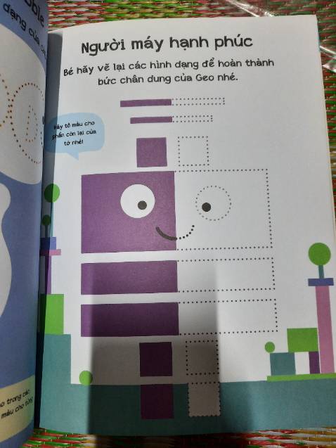 - Hãy bắt đầu bằng cách đồng hành cùng con để khám phá cuốn sách này. Hãy đọc các từ và trò chuyện về những bức tranh, sau đó khuyến khích trẻ hoàn thành từng hoạt động một. Có rất nhiều bức tranh để trẻ sao chép lại bằng cách vẽ theo những đường thẳng đứng, đường ngang và đường cong – tất cả đều là những kỹ năng vận động quan trọng để chuẩn bị cho trẻ học viết. Khi thấy một đường đứt nét nghĩa là trẻ có thể vẽ đồ lên đó để hoàn thành hoạt động.