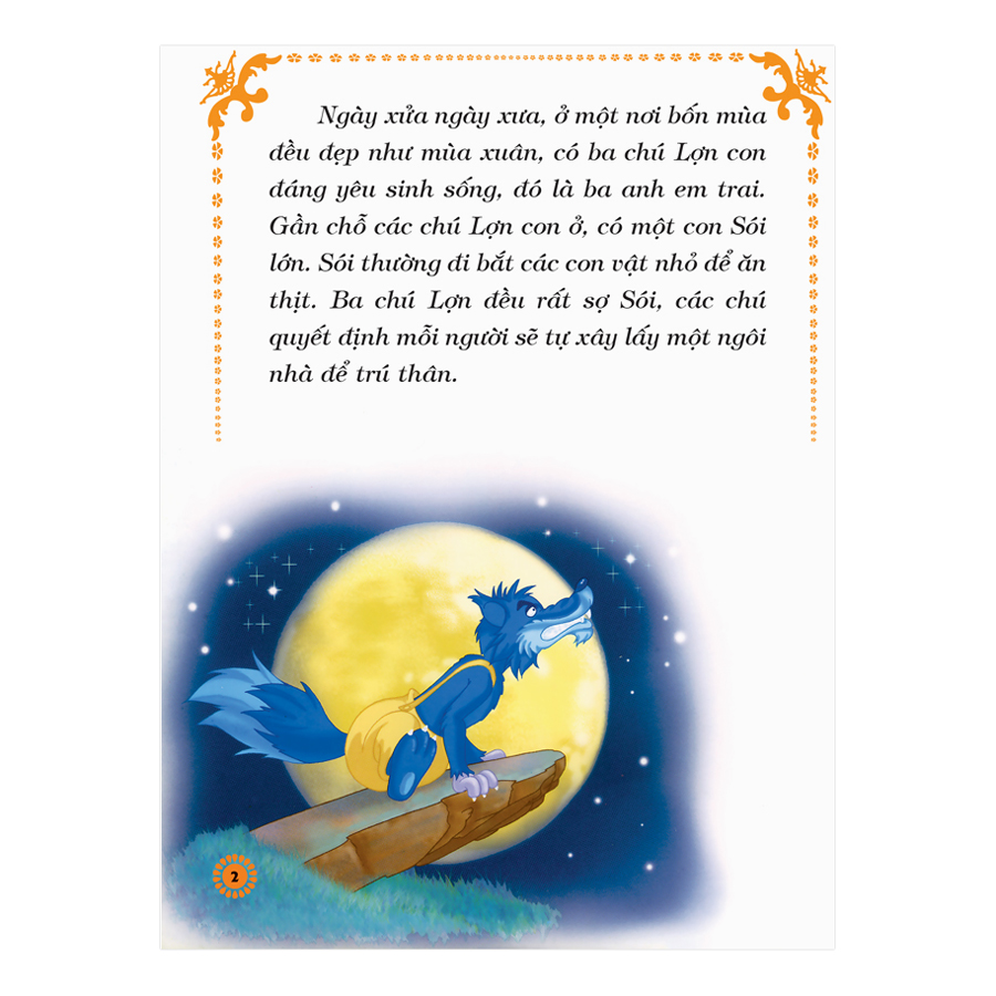 - "Ngày xửa ngày xưa, ở một nơi bốn mùa đều đẹp như mùa xuân, có ba chú Lợn con đáng yêu sinh sống, đó là ba anh em trai. Gần chỗ các chú Lợn con ở, có một con Sói lớn. Sói thường đi bắt các con vật nhỏ để ăn thịt. Ba chú Lợn đều rất sợ Sói, các chú quyết định mỗi người sẽ tự xây lấy một ngôi nhà để trú thân."
