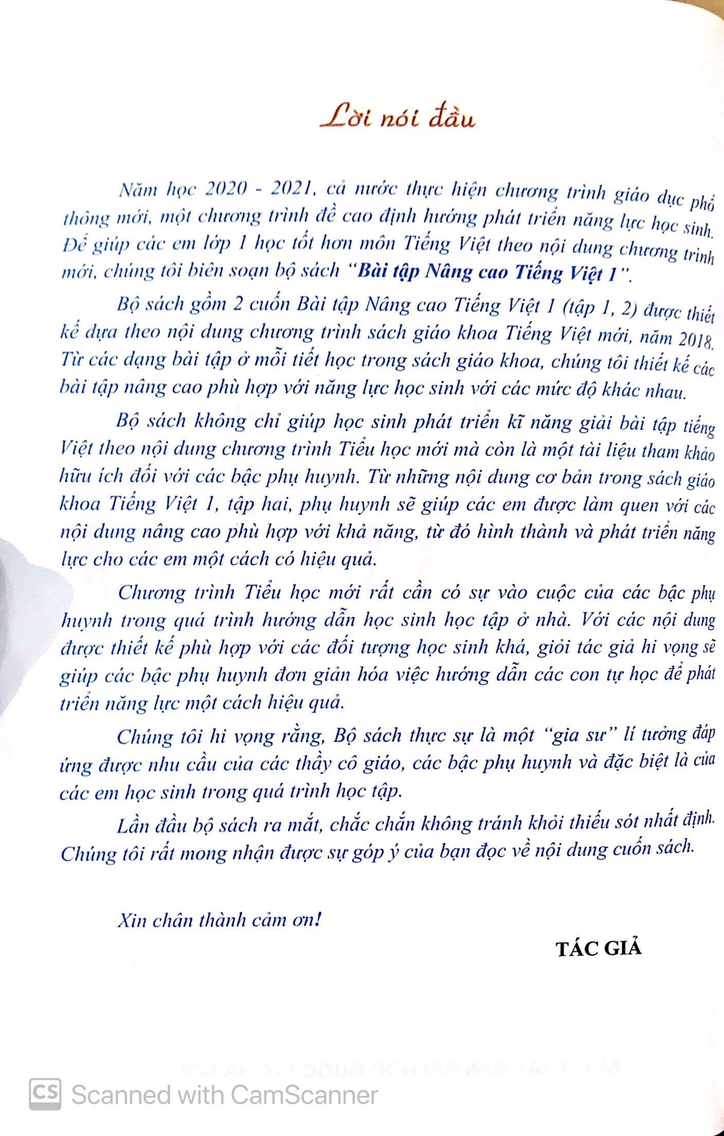 Năm học 2020 - 2021, cả nước thực hiện chương trình giáo dục phổ thông mới, một chương trình đề cao định hướng phát triển năng lực học sinh. Để giúp các em lớp 1 học tốt hơn môn Tiếng Việt theo nội dung chương trình mới, chúng tôi biên soạn bộ sách “Bài tập Nâng cao Tiếng Việt 1”.