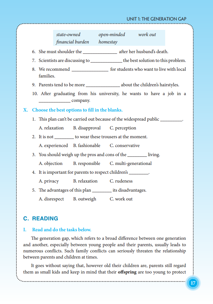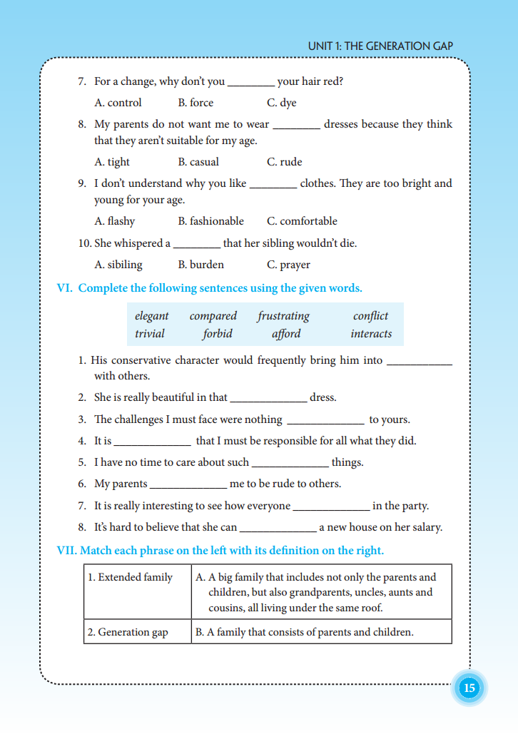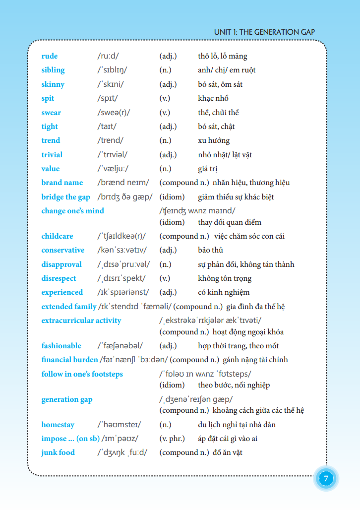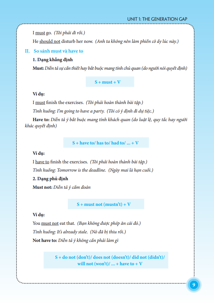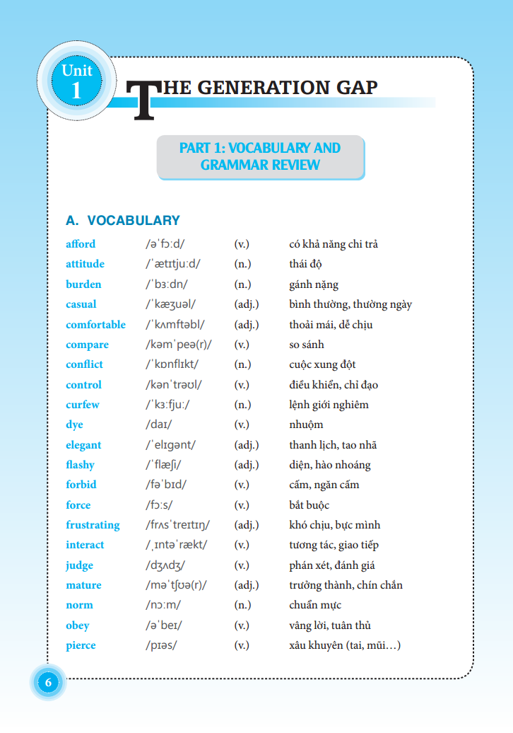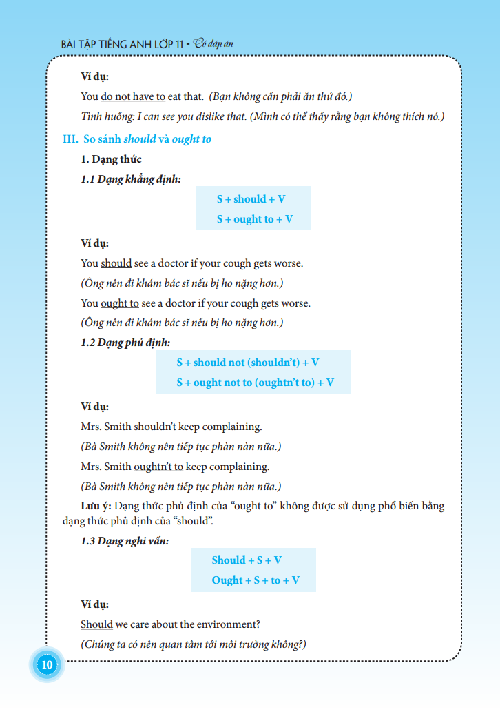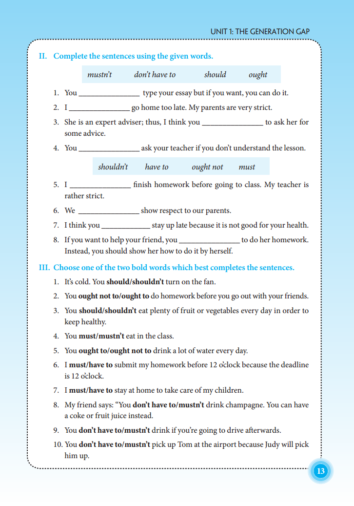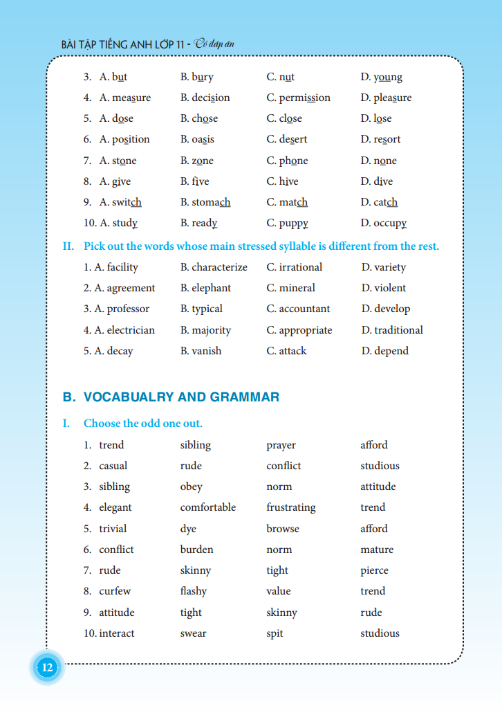 Mỗi bài học gồm các bài tập đa dạng về hình thức giúp các em học sinh rèn luyện kĩ năng làm bài: chọn đáp án đúng nhất, chọn ra từ có dấu nhấn khác với từ còn lại, chọn ra từ có cách phát âm khác từ còn lại, chia động từ, viết lại câu theo gợi ý không làm đổi nghĩa, điền giới từ thích hợp, sắp xếp lại câu theo một trật tự đúng, điền từ vào chỗ trống, tìm lỗi sai,...