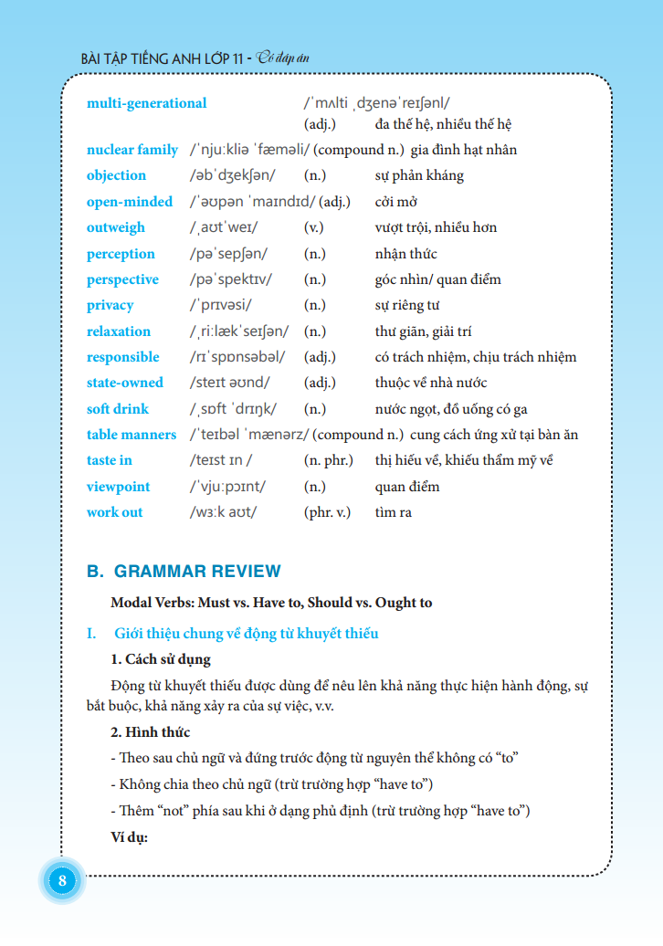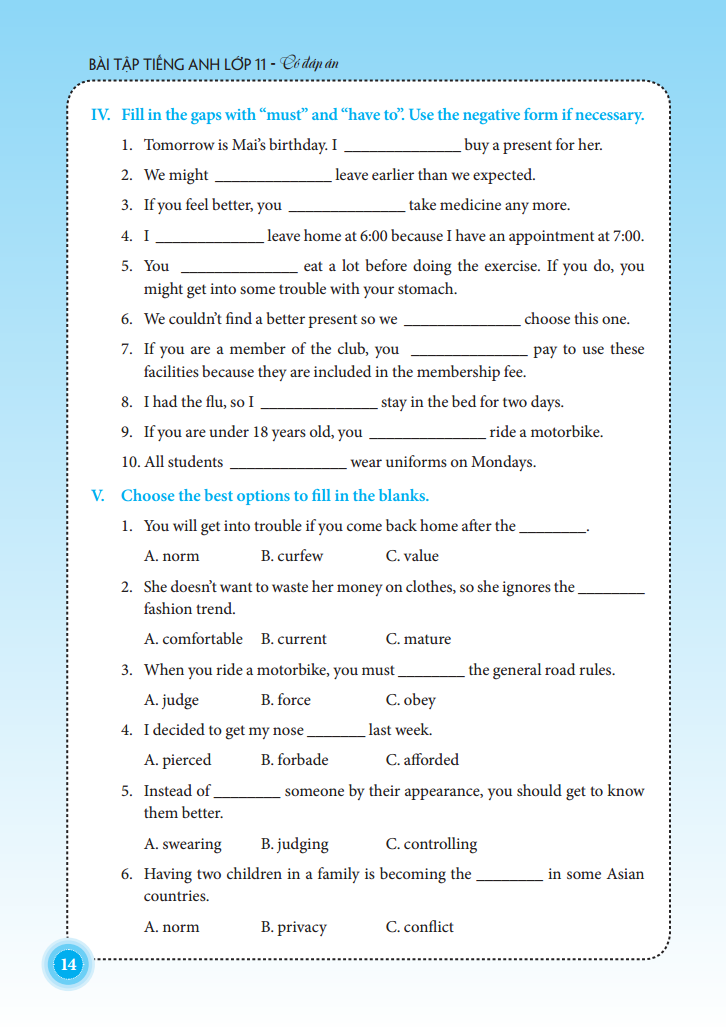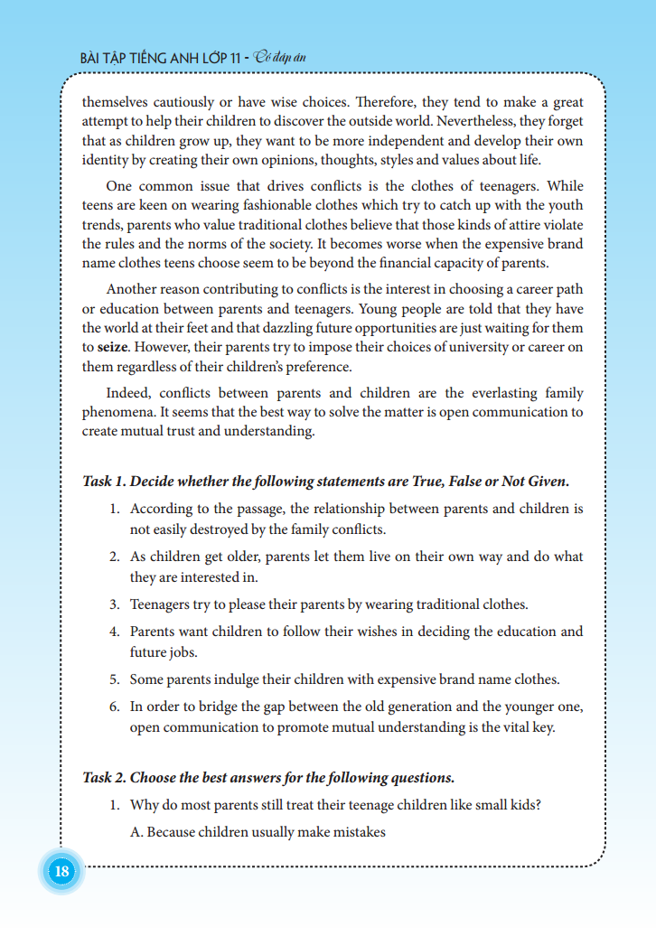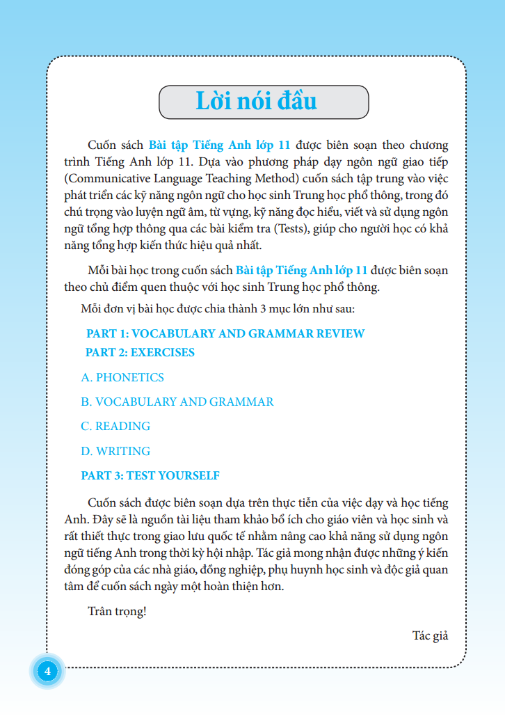 Bài Tập Tiếng Anh Lớp 11 - Có Đáp Án được biên soạn theo chương trình mới của Bộ Giáo dục và Đào tạo. Cuốn sách gồm 10 bài học đa dạng về chủ đề: Friendship, A party, Volunteer work, Competitions, Celebrations, The post office, Hobbies, Space Conquest,...
