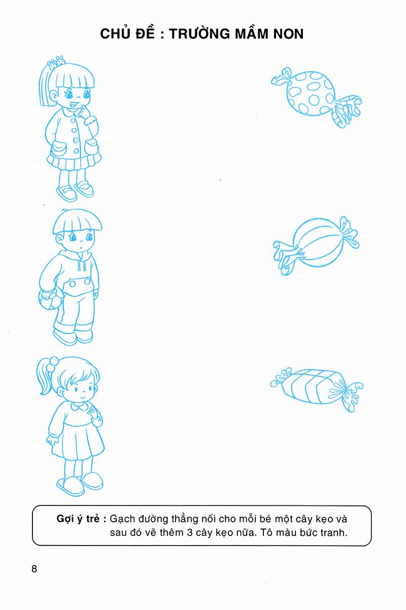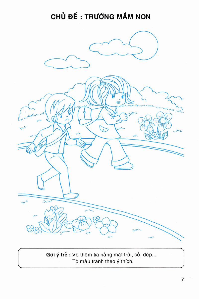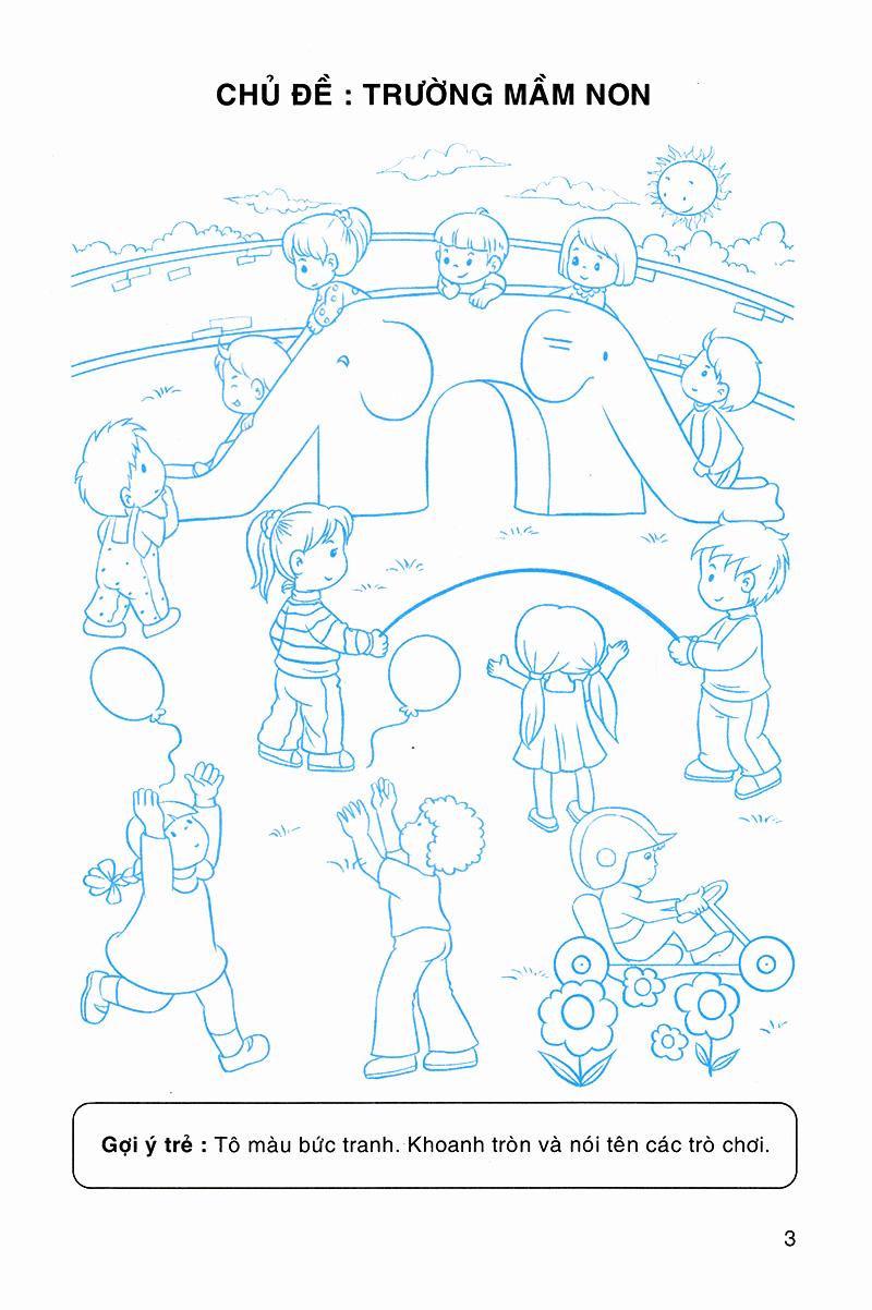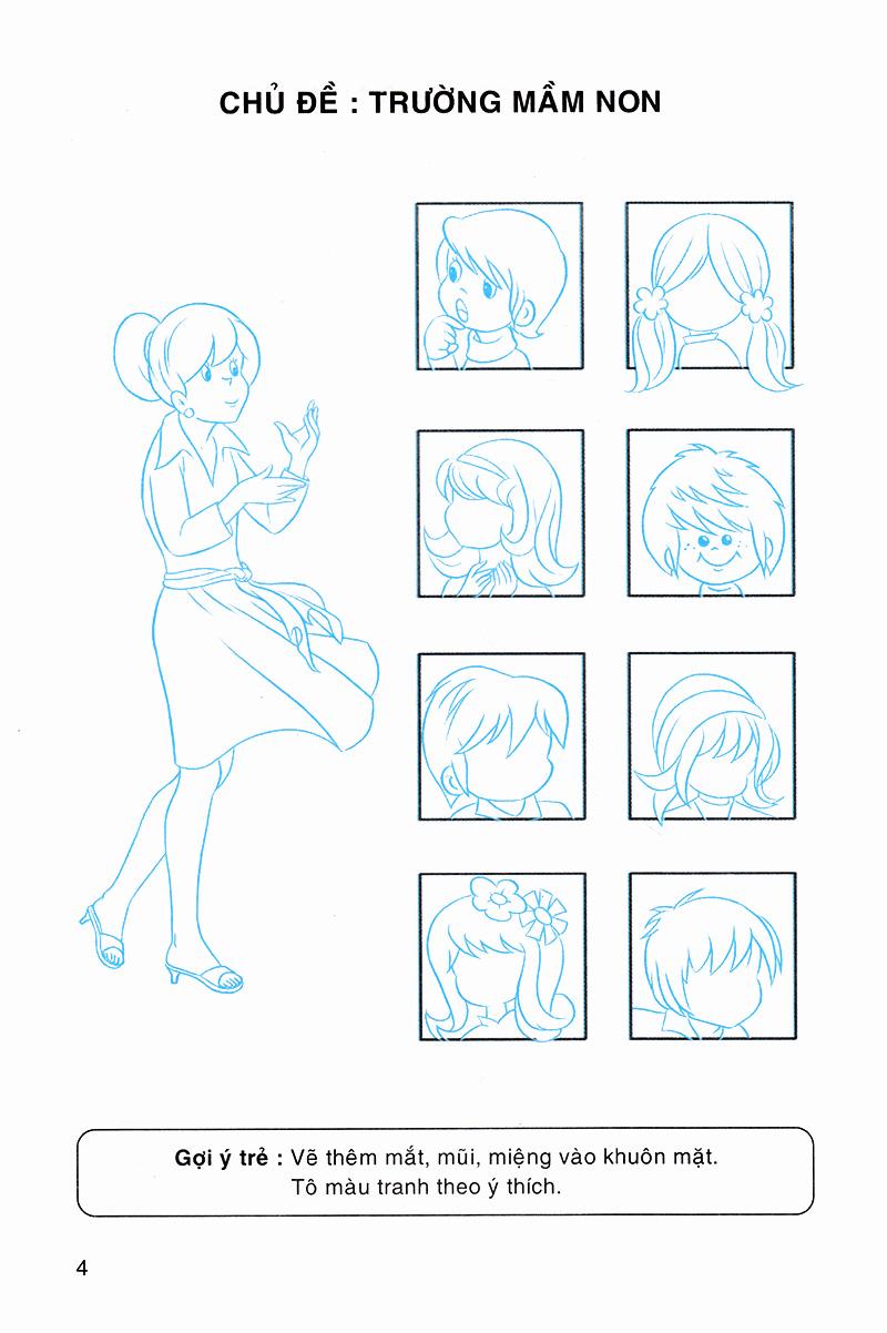 Cuốn sách này được thiết kế theo từng chủ đề như , trường mầm non, cơ thể người, nghề nghiệp, thế giới động vật, thế giới thực vật, phong cảnh... và gợi ý thực hiện một cách rõ ràng, giúp trẻ hoạt động theo hướng tích cực, thể hiện tinh thần sáng tạo trong nét vẽ, tô màu, hoàn thiện hình, vẽ thêm hình...