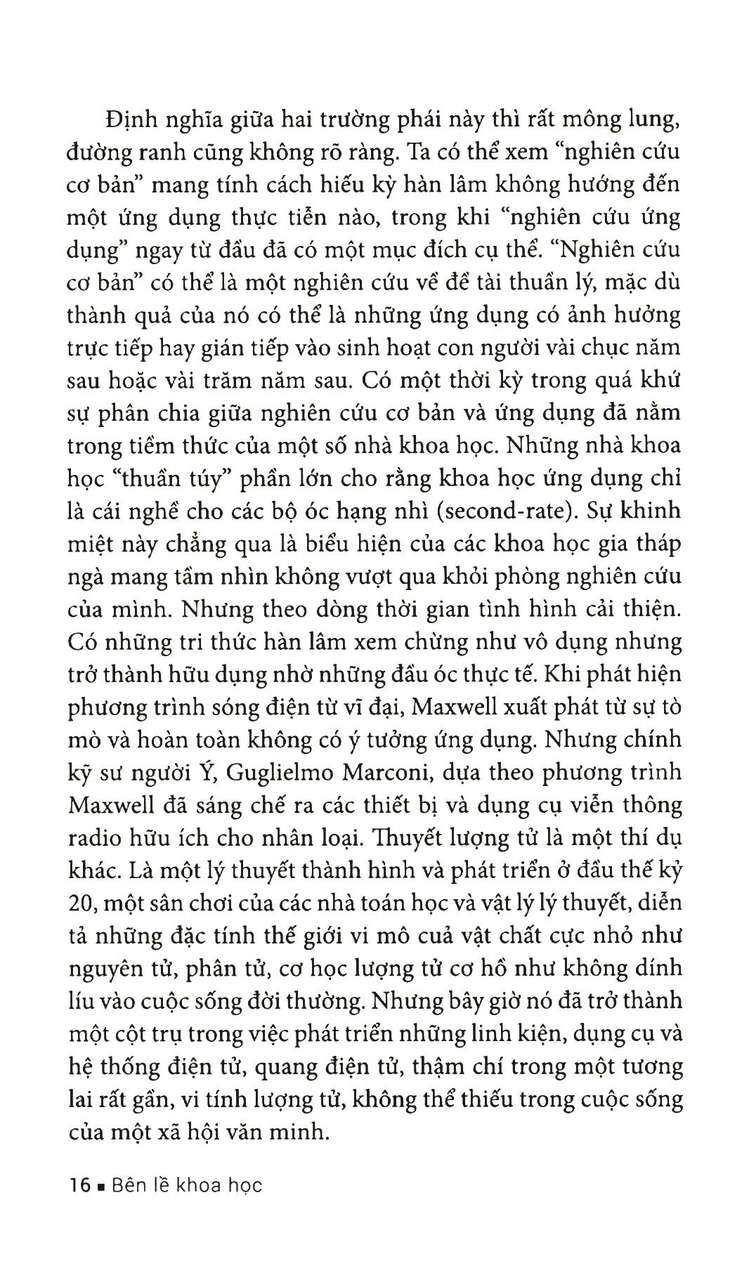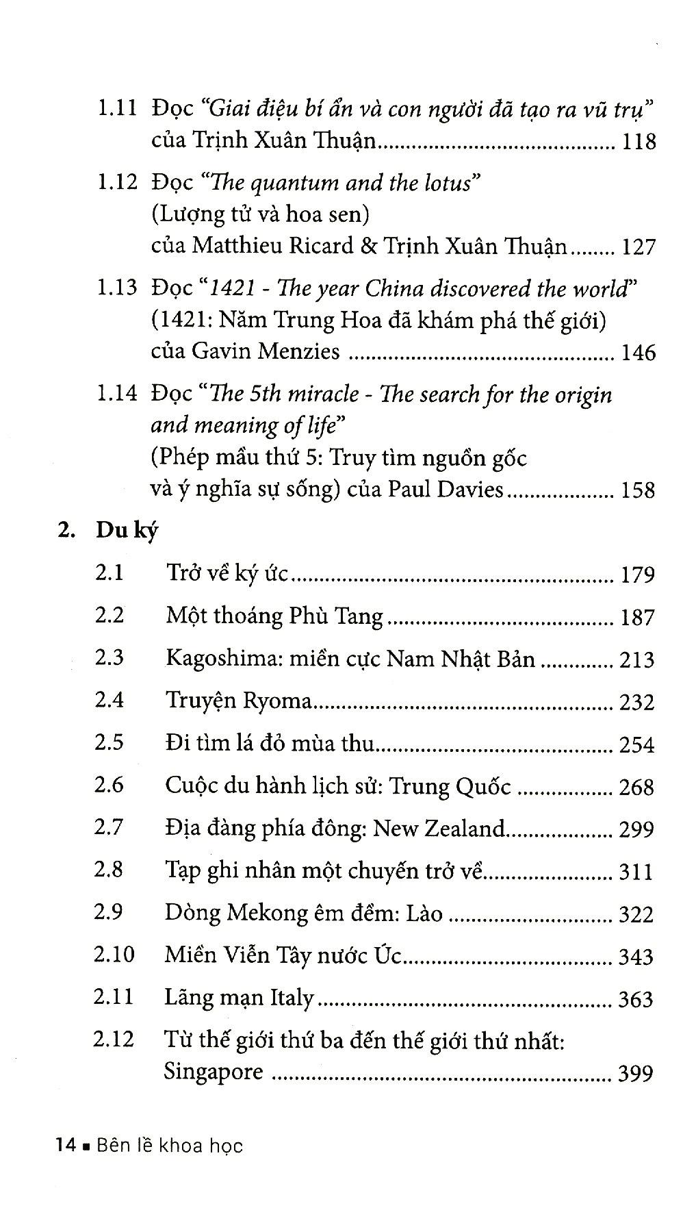 Cuốn sách gồm hai phần chính: Phần 1: Khoa học và Giáo dục, và Phần 2: Du ký.Phần I, “Khoa học và Giáo dục” có 14 tiểu đề, bàn về những vấn nạn trong nghiên cứu khoa học nói chung, những bất cập trong nghiên cứu và giáo dục tại Việt Nam nói riêng và vài bài tạp bút về khoa học, ngôn ngữ. Tác giả cũng dành 4 tiểu đề để tập trung luận bàn những cuốn sách của các học giả, chẳng hạn như cuốn “The quantum and the lotus” (Lượng tử và hoa sen) của hai nhà khoa học Matthieu Ricard & Trịnh Xuân Thuận.