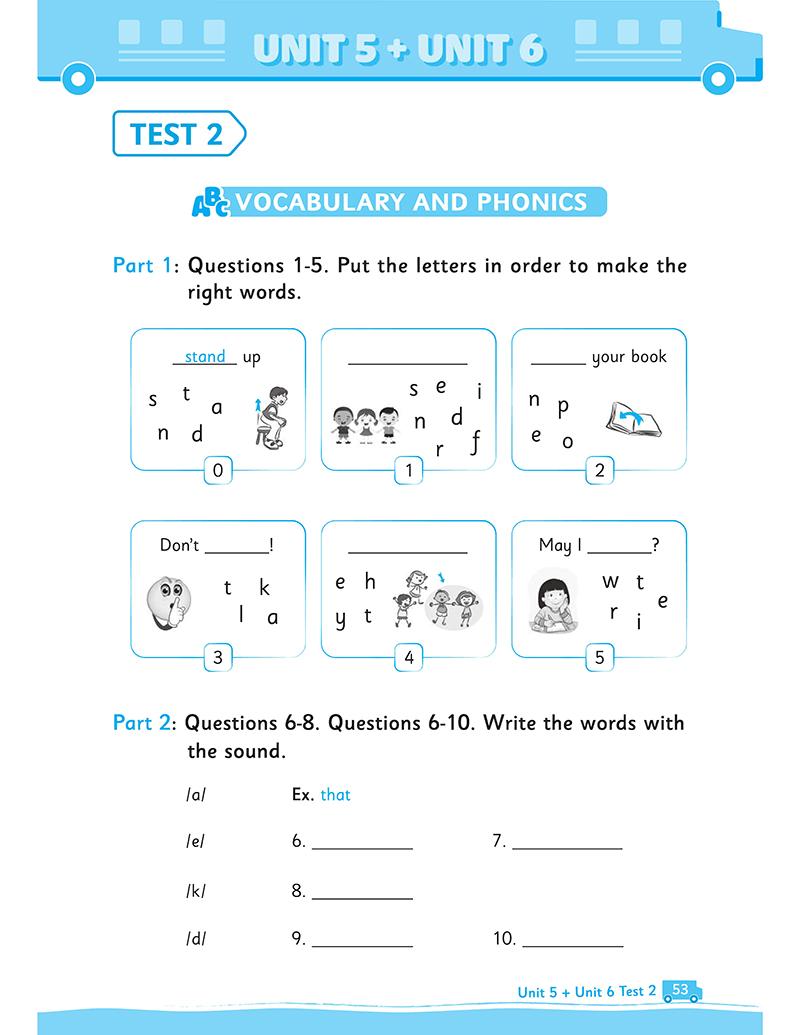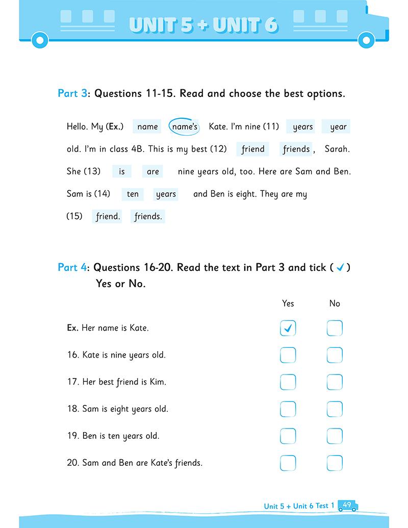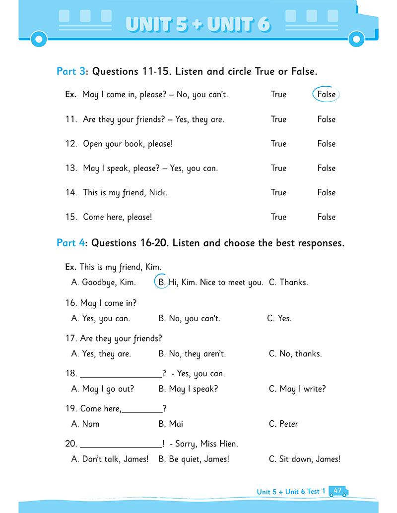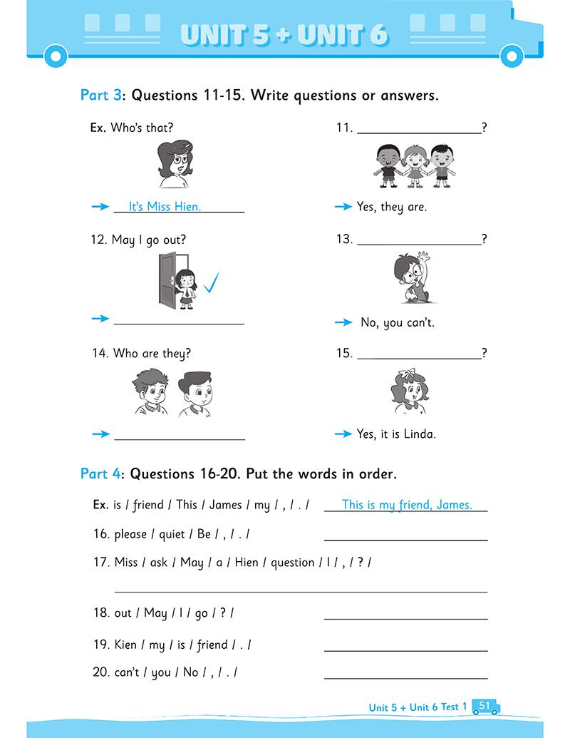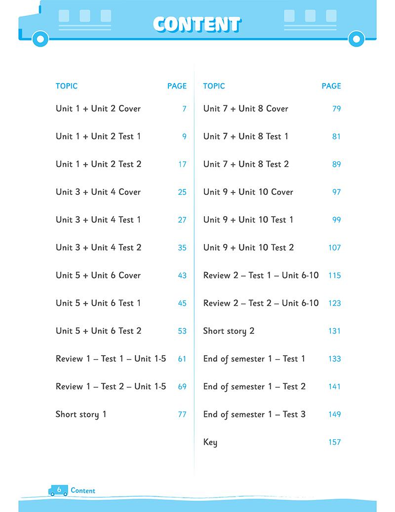 Cứ hai bài sẽ có 2 bài kiểm tra, tất cả các bài kiểm tra đều được thiết kế theo quy định thông tư mới nhất về kiểm tra môn Tiếng Anh tiểu học.
