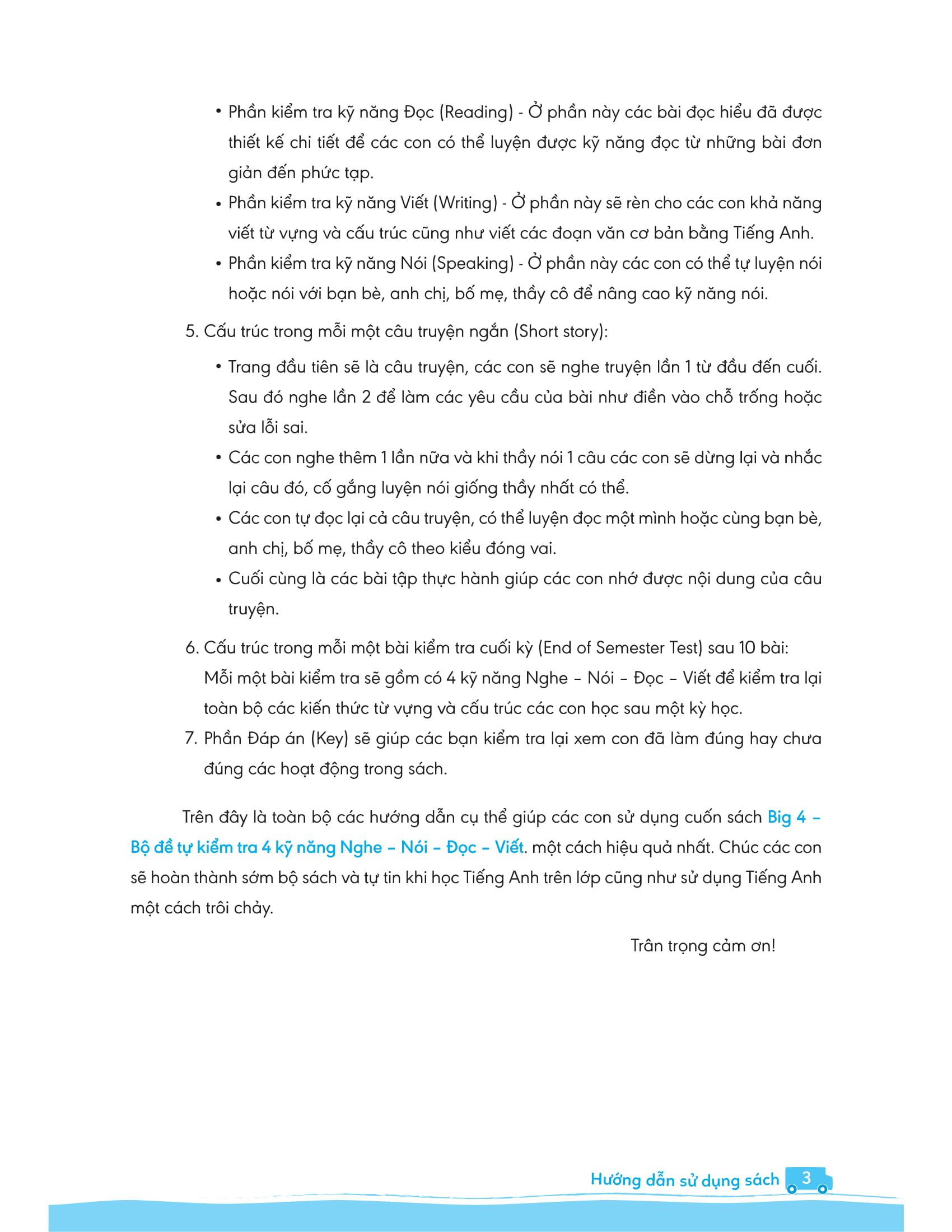 Big 4 Bộ Đề Tự Kiểm Tra 4 Kỹ Năng Nghe – Nói – Đọc – Viết (Cơ Bản và Nâng Cao) Tiếng Anh Lớp 3 Tập 2 viết theo chuẩn khung chương trình mới của Bộ Giáo Dục và Đào Tạo giúp các em học sinh lớp 3 củng cố và phát triển toàn diện các kỹ năng: Nghe – Nói – Đọc – Viết Tiếng Anh.