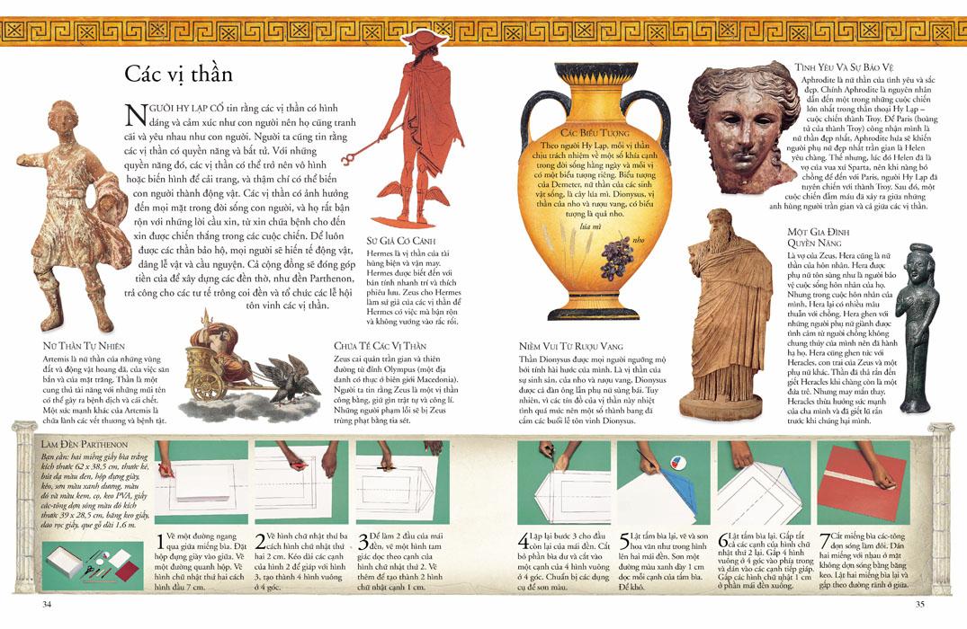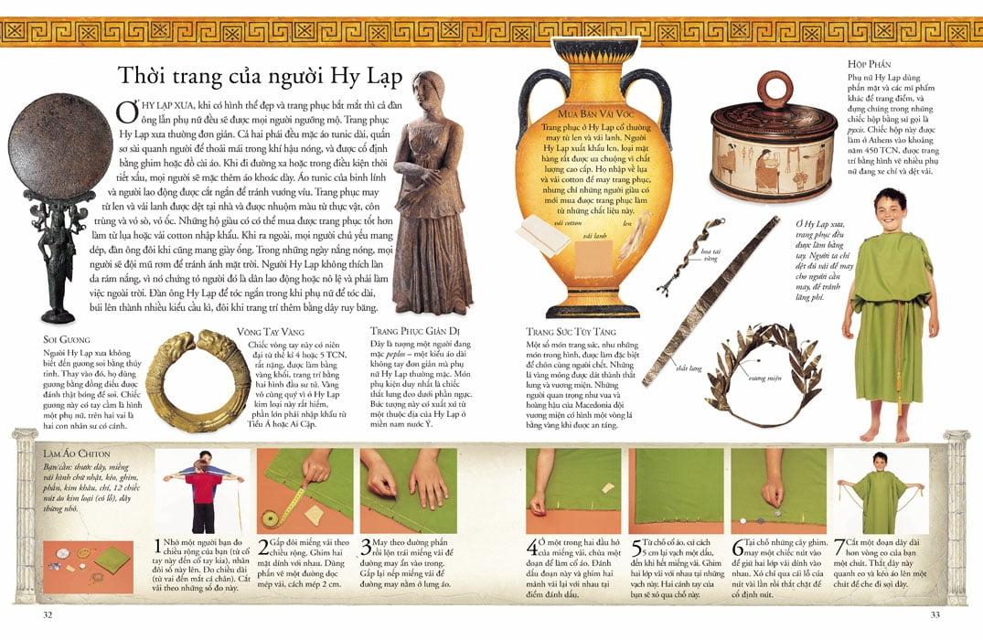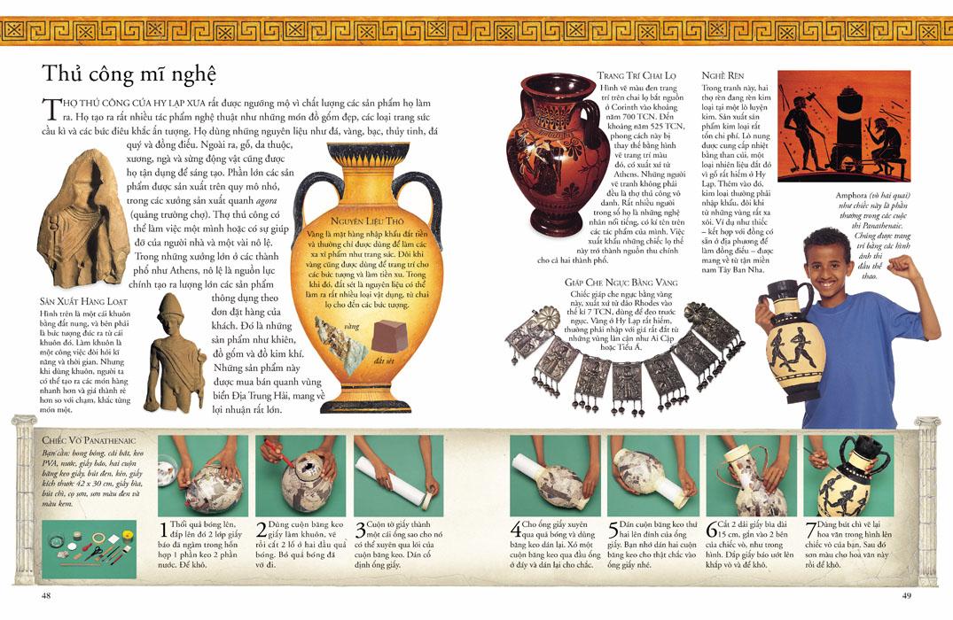 Quay trở về quá khứ để tìm hiểu xem người Hy Lạp cổ đại đã sống như thế nào. Hơn 350 tranh ảnh, hình minh họa và bản đồ lịch sử. 15 trò chơi thủ công thú vị và dễ làm, giúp các em tự tạo ra những món đồ mô phỏng thời xưa – xây mô hình đền Parthenon, vẽ bích họa cá heo, làm mặt nạ và học bảng chữ cái Hy Lạp cổ. Sách phù hợp với trẻ em từ 8 đến 12 tuổi.