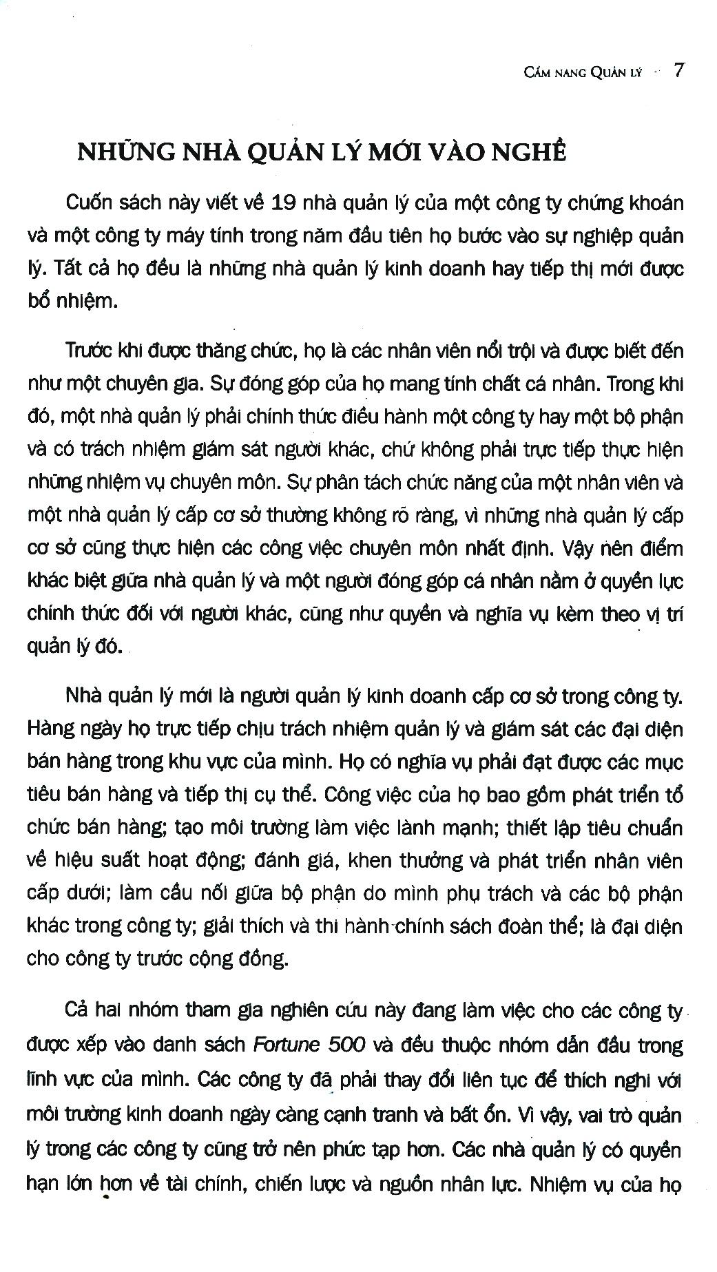 “Cẩm nang quản lý” chứa đựng những quan điểm sáng suốt dành cho các nhà quản lý trẻ và cả những nhà quản lý kỳ cựu, đồng thời là nguồn thông tin vô giá cho cấp lãnh đạo trong việc điều hành các nhà quản lý. Đồng thời, cũng thể hiện một cái nhìn lôi cuốn từ bên trong đối với vị trí quản lý. Thách thức, lúng túng, sai lầm và thành công – cuốn sách cung cấp bức tranh toàn cảnh về quá trình học hỏi và phát triển để trở thành một nhà quản lý xuất sắc.