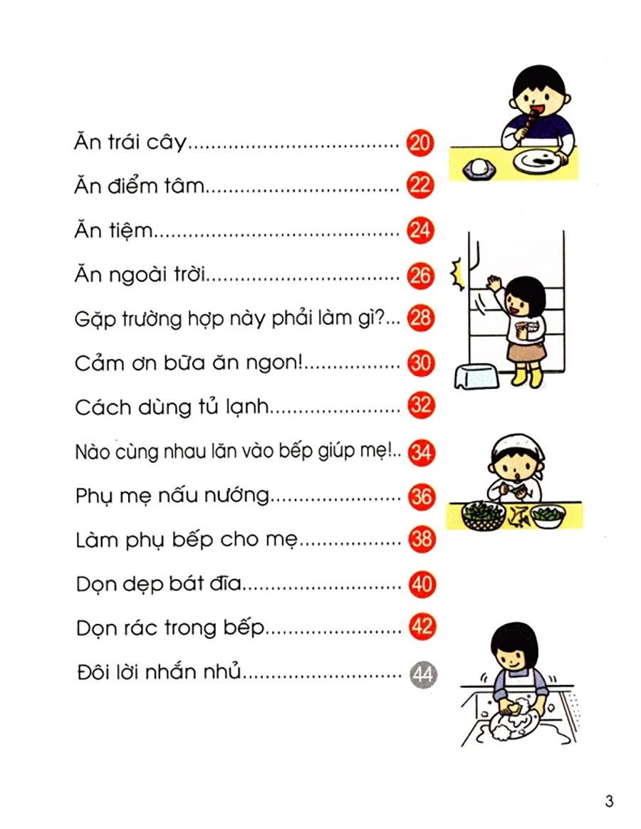 - Cuốn “Kĩ năng khi ăn uống” hướng dẫn các em từ cách cầm thìa, đũa sao cho đúng cách, rửa tay trước khi ăn, lấy lượng thức ăn vừa đủ ăn, ăn hết phần của mình…