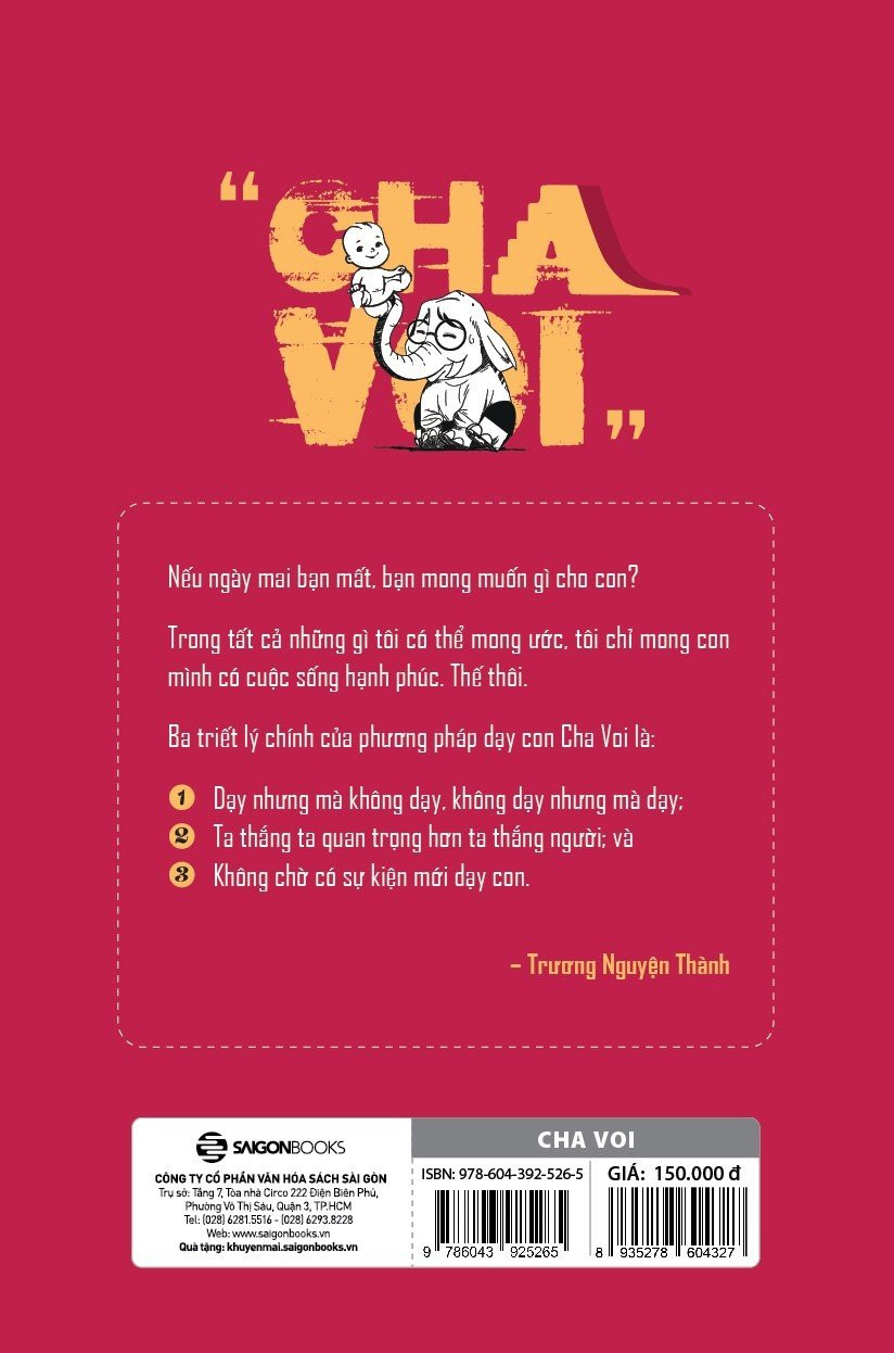 Cuốn sách đáng đọc dành cho cả các bậc đã làm cha mẹ, chưa làm cha mẹ và cả những người con đọc để biết những gì mình cần trang bị trong thời đại số này. Từ những suy nghĩ, chiêm nghiệm, nghiên cứu liên tục về cách dạy con, tác giả đã hình thành một triết lý và phong cách dạy con theo kiểu Cha Voi của riêng mình, phối hợp từ văn hóa dạy con Việt Nam, Mỹ, Nhật, và Đan Mạch. ----- "Mục tiêu cuối cùng của việc dạy con chính là cha mẹ có thể an tâm rằng con sẽ sống thành công và hạnh phúc khi không có mình. Cái cảm giác tự do, không phải lo lắng ấy thật sự thoải mái và hạnh phúc vô cùng!" - Cha Voi ------ MỤC LỤC: 🌱Lời tác giả 🌱Lời cảm ơn 🌱PHẦN 1. THỬ THÁCH DẠY CON Ở THỜI ĐẠI SỐ 🌱PHẦN 2. TÔI ĐÃ ĐƯỢC DẠY DỖ NHƯ THẾ 🌱PHẦN 3. CHA VOI, MẸ HỔ VÀ NHỮNG CÁCH DẠY CON KHÁC - Sức ảnh hưởng của môi trường dưỡng dục - Bốn phong cách dạy con: Độc đoán (Mẹ Hổ), Dễ Dãi, Dưỡng dục (Cha Voi), Bỏ rơi (Mặc kệ) - "Thương cho roi cho vọt/Ghét cho ngọt cho bùi" có còn đúng? - Độc lập: Một giá trị cốt lõi trong văn hóa Mỹ - Nhân cách: Điều cha mẹ Nhật chú trọng - Chơi để sống hạnh phúc: Triết lý của cha mẹ Đan Mạch 🌱PHẦN 4. TÔI LÀM CHA VOI - Bốn trụ cột để phát triển cá nhân: Kiến thức, Kỹ năng, Nhân cách, Tư duy - Quốc có quốc pháp, gia có gia quy - Rèn luyện kỹ năng sống - Mài giũa nhân cách - Khai phóng tư duy 🌱Thay lời kết 🌱Tài liệu tham khảo
