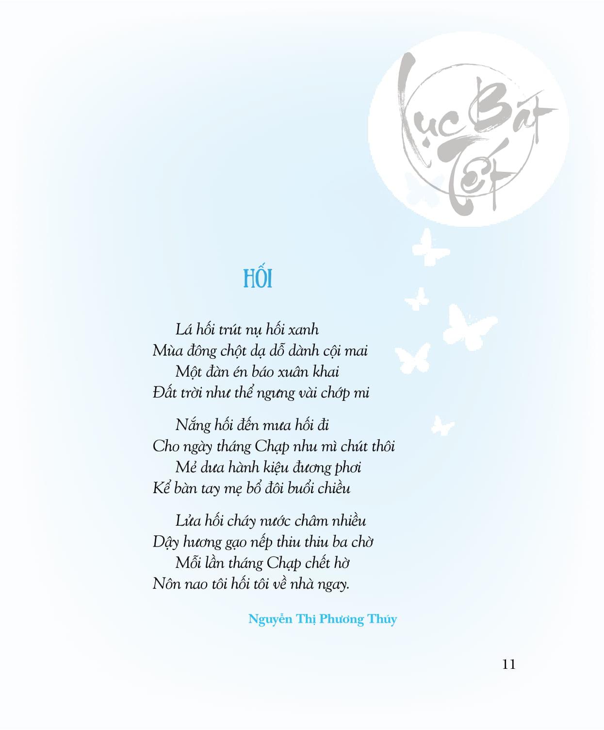 Cuộc thi thơ Lục bát Tết, lần đầu tiên do Saigon Books tổ chức, đặc biệt đáng nhớ vì diễn ra vào những ngày tháng Chạp, giáp Tết Đinh Dậu (2017). Khi những dòng người ngược xuôi, náo nhiệt trở lại quê nhà vui Tết thì Lục bát Tết cũng lần lượt đổ về hộp thư điện tử của chúng tôi. Lục bát, đương nhiên là phải có quy định niêm luật, nhưng vượt lên những niêm luật mang tính kỹ thuật, đó chính là QUY LUẬT TÌNH CẢM, là nhịp điệu thương nhớ gieo mầm, nảy nở theo mùa màng. Chọn 158 tác phẩm của 50 tác giả vào Chung khảo cuộc thi Lục bát Tết để in trong tập sách này, chúng tôi xem đây như là món quà nhỏ gửi đến những bạn đọc, bạn viết yêu thơ. Và, cao hơn là yêu quê hương mình còn lận đận một nắng hai sương, còn trĩu nặng toan lo trên những bờ vai gầy guộc. Chạm một miền Xuân là chạm vào một miền cảm xúc mênh mang của bao người.