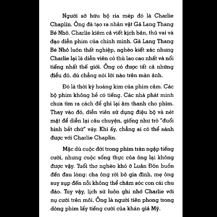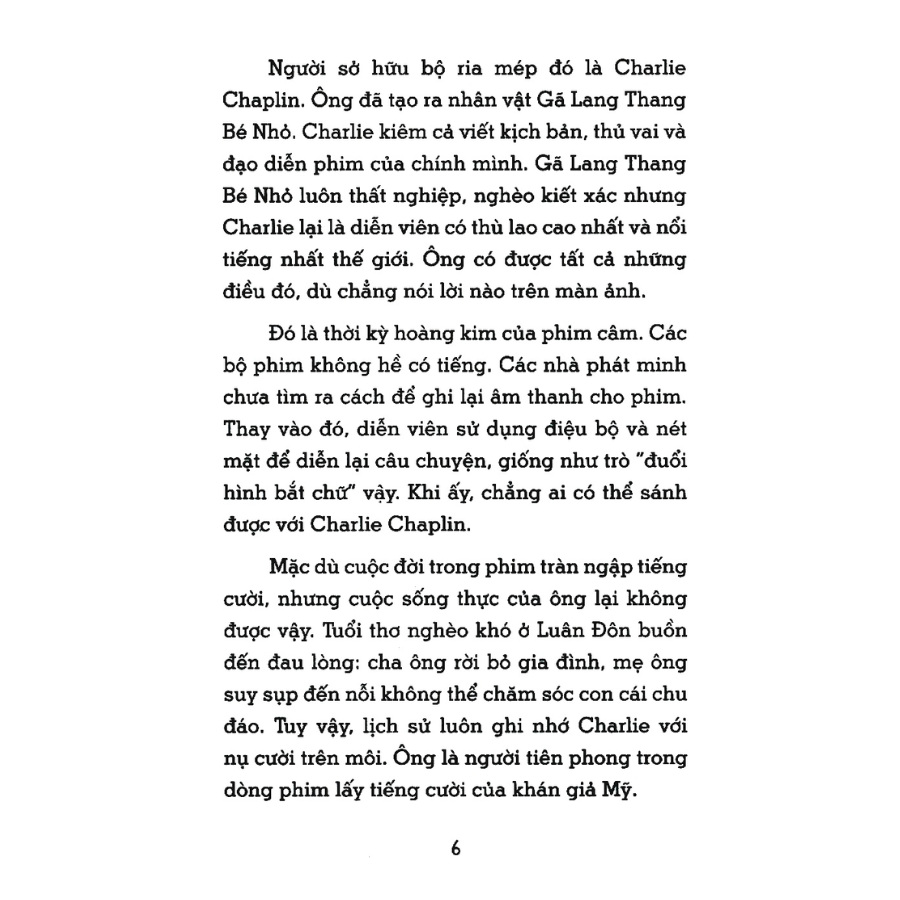 Cuốn sách tóm tắt cuộc đời Chaplin từ tuổi thơ nghèo khó ở London đến khi trở thành ngôi sao toàn cầu. Chaplin là một tài năng thiên bẩm, không chỉ nổi bật với khả năng diễn xuất mà còn với vai trò đạo diễn, biên kịch và nhà sản xuất. Ông nổi tiếng với nhân vật "The Tramp" (Sác-lô) trong nhiều bộ phim kinh điển như "The Kid" (1921) và "City Lights" (1931). Cuộc đời và sự nghiệp của Chaplin là một hành trình từ nghèo khó đến vinh quang, với những cống hiến to lớn cho nghệ thuật điện ảnh.