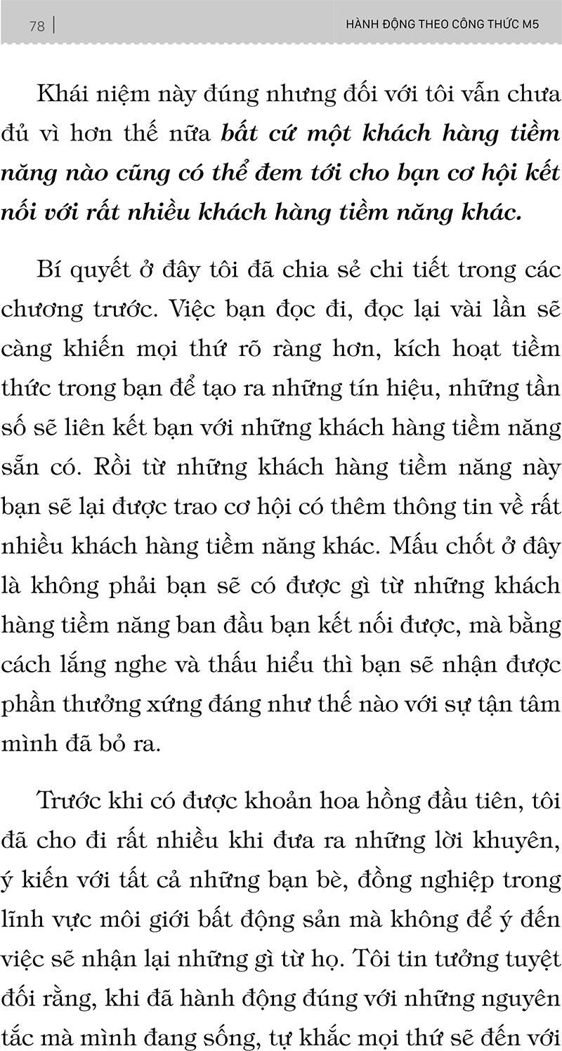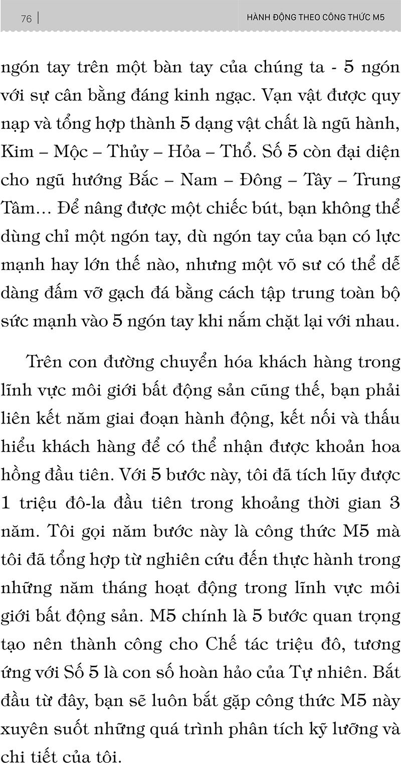 Có lẽ thế, nên cuốn sách mới có tên: CHẾ TÁC TRIỆU ĐÔ - M5 Công thức triệu đô trong ngành môi giới Bất Động Sản. Như một lời hứa: "Bạn sẽ kiếm được 1 triệu Đô nhanh thôi nếu bạn khám phá và vận dụng những tri thức trong cuốn sách này".