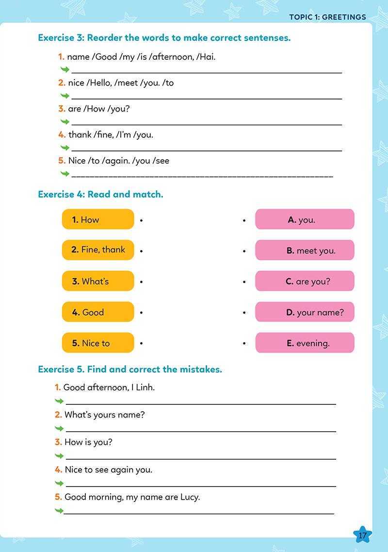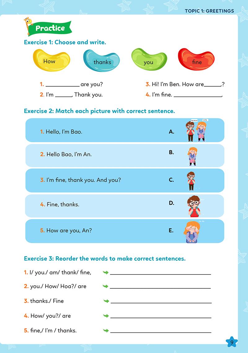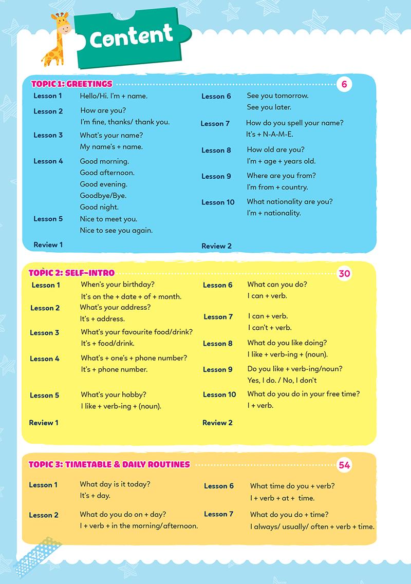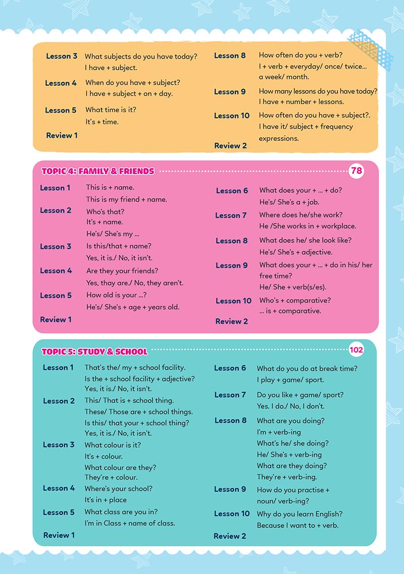 Với các chủ đề quen thuộc và gần gũi trong cuộc sống như Greetings, Family & Friends, Study & School… không chỉ giúp các em tiếp thu kiến thức Ngữ pháp hiệu quả hơn mà còn biết cách vận dụng vào giao tiếp thực tế hàng ngày.