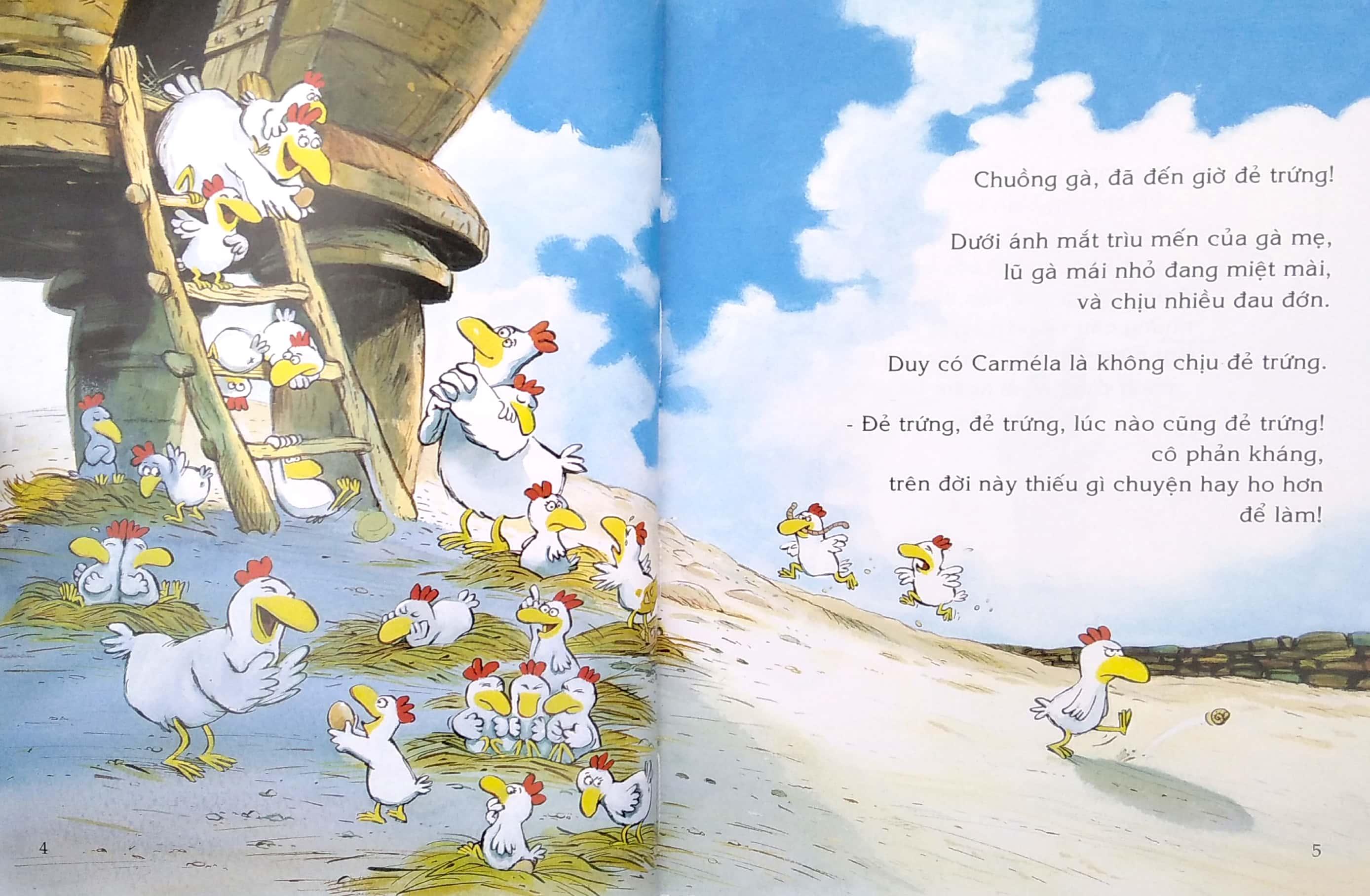 Dưới ánh nhìn trìu mến của mẹ, lũ gà mái nhỏ gắng rặn đẻ và khó nhọc cho ra thành phẩm. Duy có Carméla là cự tuyệt không chịu đẻ trứng!