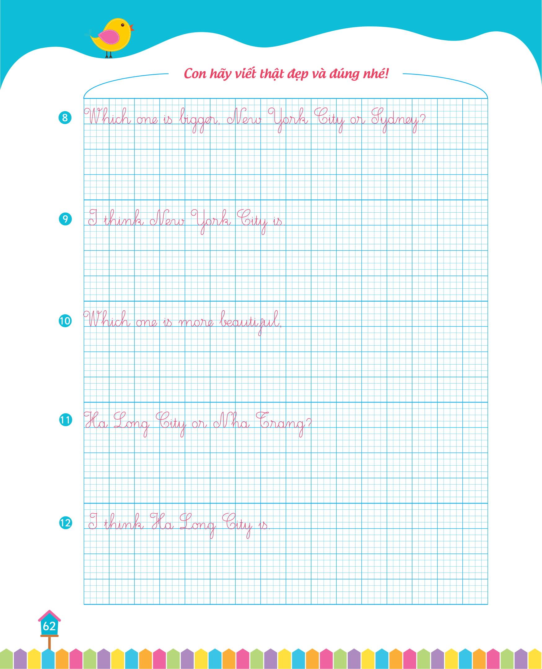 5. Khổ sách được thiết kế hợp lý, thuận tiện cho con mang đi học mọi lúc mọi nơi. Giấy in chất lượng, đảm bảo con tập viết bằng bút mực không bị nhòe, lem, … độ trắng tự nhiên giúp bảo về mắt con.
