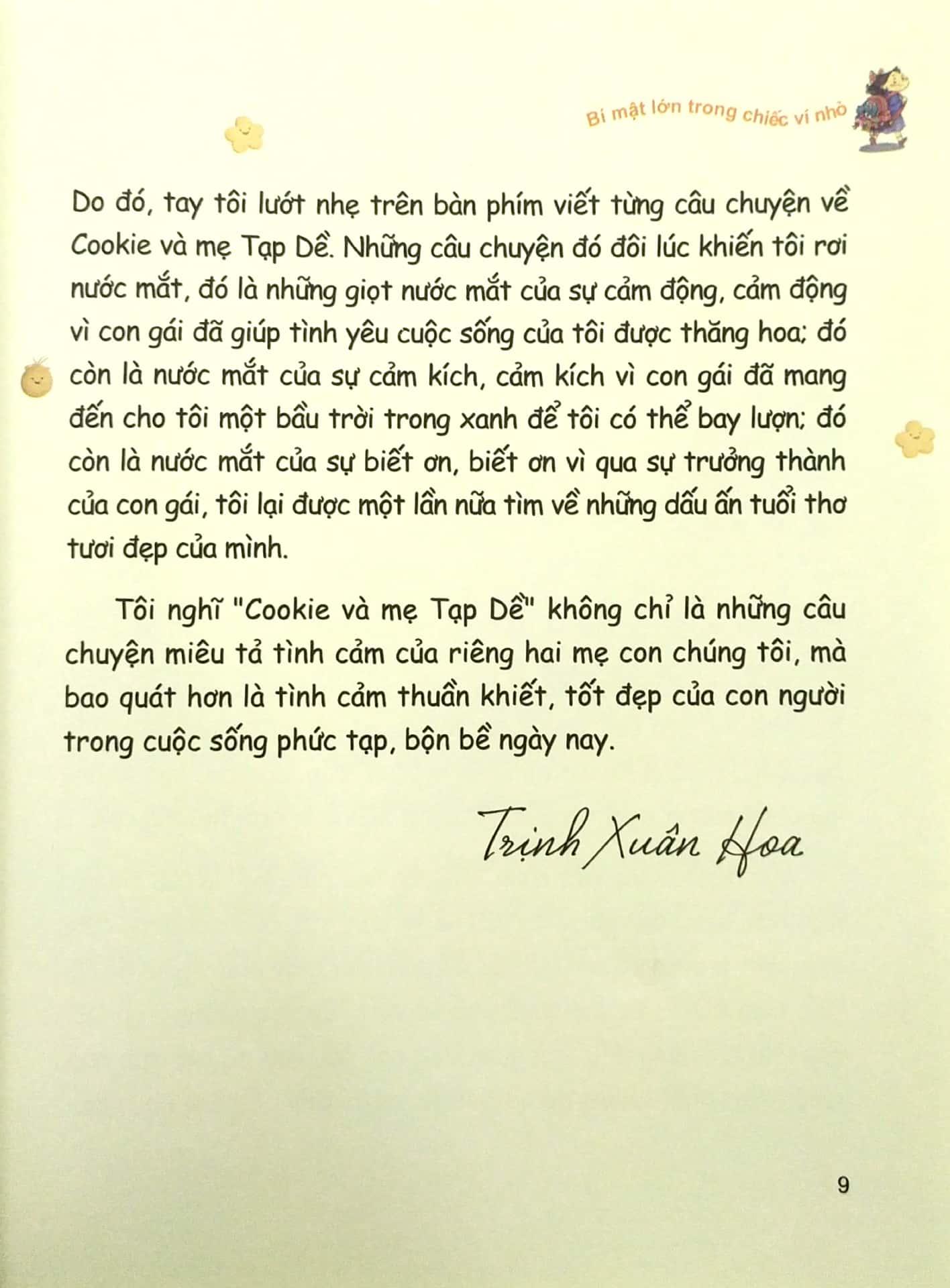 Trong truyện “Bí mật lớn trong chiếc ví nhỏ”, Cookie bắt chước dáng vẻ hàng ngày của mẹ, đi giày cao gót, đeo túi xách của mẹ để đi làm! Trước khi ra khỏi nhà, Cookie còn đặc biệt bỏ vào túi xách một chiếc ví nhỏ, nói đây là “bí mật”. Rốt cuộc trong chiếc ví nhỏ đó có gì? Trong truyện “Bông hoa hồng đặc biệt nhất”, bố vì trễ chuyến bay mà không kịp mua hoa hồng tặng mẹ, nhưng hôm đó lại là Lễ Tình nhân! Cookie giận dỗi, cô bé nghĩ ngày Lễ Tình nhân sao bố lại không tặng mẹ hoa hồng chứ? Thế là, cô bé quyết định đi mua hoa cùng bố, nhưng đã tối muộn rồi, ở đâu còn bán hoa hồng đây?Giá sản phẩm trên Tiki đã bao gồm thuế theo luật hiện hành. Bên cạnh đó, tuỳ vào loại sản phẩm, hình thức và địa chỉ giao hàng mà có thể phát sinh thêm chi phí khác như phí vận chuyển, phụ phí hàng cồng kềnh, thuế nhập khẩu (đối với đơn hàng giao từ nước ngoài có giá trị trên 1 triệu đồng).....