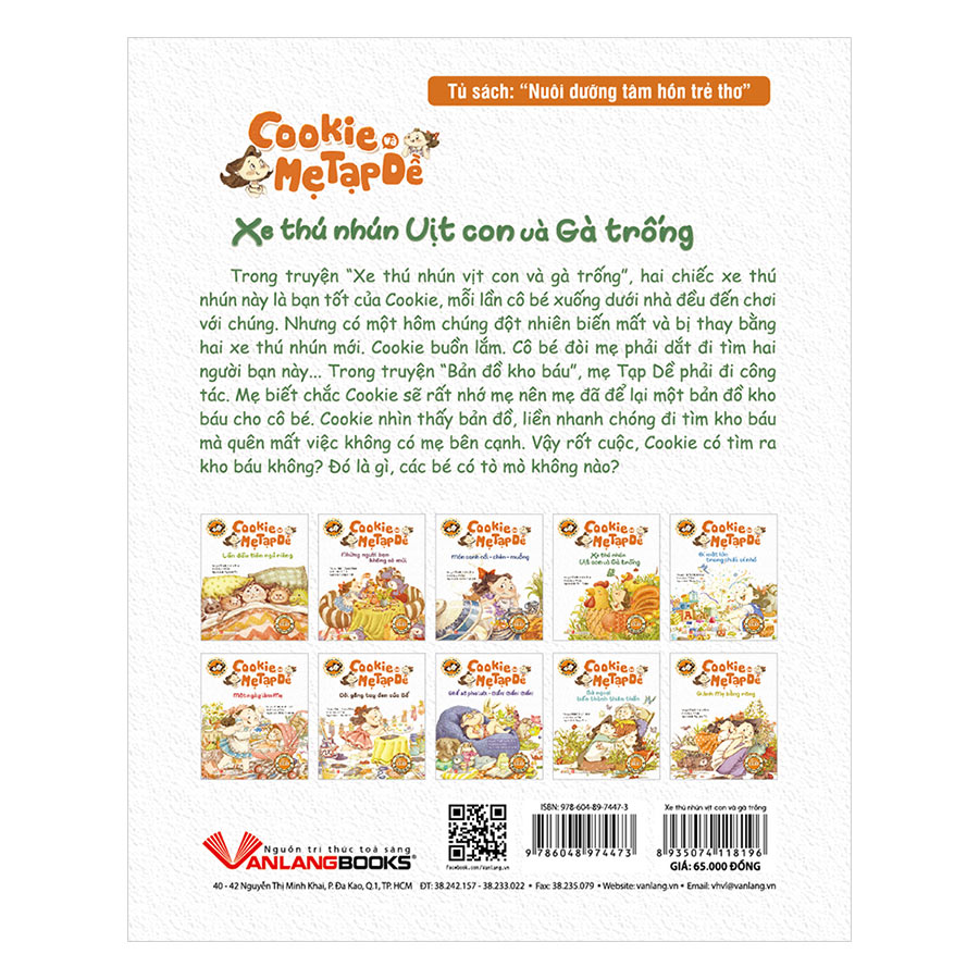 Trong truyện “Xe thú nhún vịt con và gà trống”, hai chiếc xe thú nhún này là bạn tốt của Cookie, mỗi lần cô bé xuống dưới nhà đều đến chơi với chúng. Nhưng có một hôm chúng đột nhiên biến mất và bị thay bằng hai xe thú nhún mới. Cookie buồn lắm. Cô bé đòi mẹ phải dắt đi tìm hai người bạn nà Trong truyện “Bản đồ kho báu”, mẹ Tạp Dề phải đi công tác. Mẹ biết chắc Cookie sẽ rất nhớ mẹ nên mẹ đã để lại một bản đồ kho báu cho cô bé. Cookie nhìn thấy bản đồ, liền nhanh chóng đi tìm kho báu mà quên mất việc không có mẹ bên cạnh. Vậy rốt cuộc, Cookie có tìm ra kho báu không? Đó là gì, các bé có tò mò không nào?Giá sản phẩm trên Tiki đã bao gồm thuế theo luật hiện hành. Bên cạnh đó, tuỳ vào loại sản phẩm, hình thức và địa chỉ giao hàng mà có thể phát sinh thêm chi phí khác như phí vận chuyển, phụ phí hàng cồng kềnh, thuế nhập khẩu (đối với đơn hàng giao từ nước ngoài có giá trị trên 1 triệu đồng).....