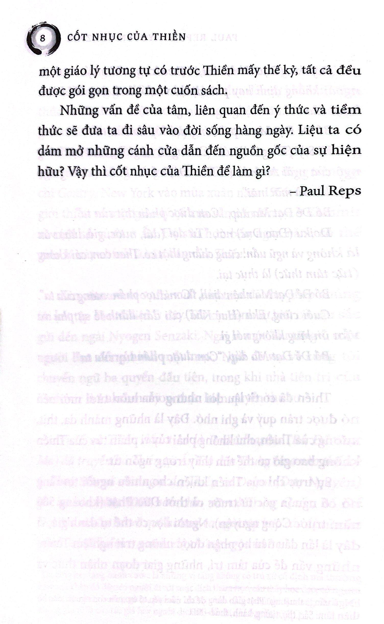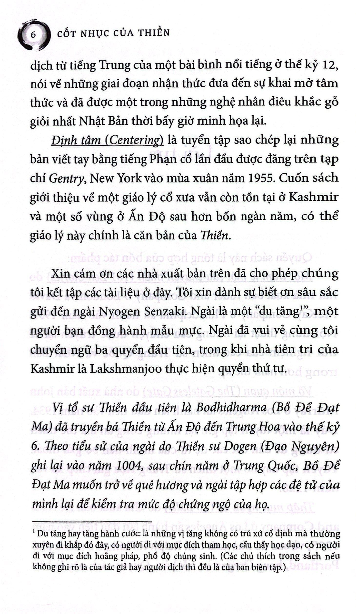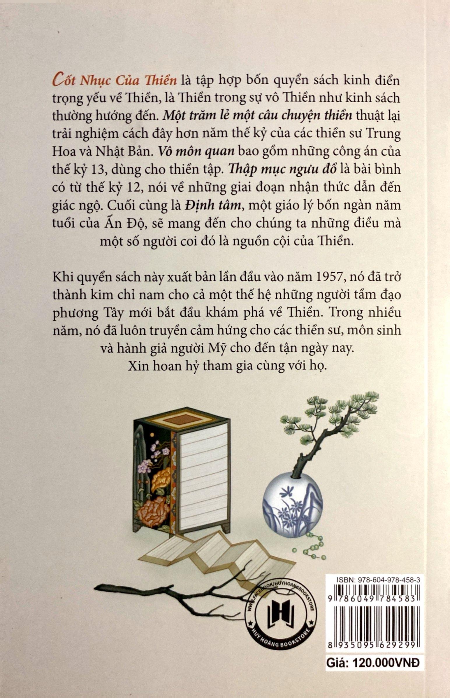 CỐT NHỤC CỦA THIỀN là tập hợp bốn quyển sách kinh điển trọng yếu về Thiền, là Thiền trong sự vô Thiền như kinh sách thường hướng đến. Một trăm lẻ một câu chuyện thiền thuật lại trải nghiệm cách đây hơn năm thế kỷ của các thiền sư Trung Hoa và Nhật Bản. Vô môn quan bao gồm những công án của thế kỷ 13, dùng cho thiền tập. Thập mục ngưu đồ là bài bình có từ thế kỷ 12, nói về những giai đoạn nhận thức dẫn đến giác ngộ. Cuối cùng là Định tâm, một giáo lý bốn ngàn năm tuổi của Ấn Độ, sẽ mang đến cho chúng ta những điều mà một số người coi đó là nguồn cội của Thiền.Khi quyển sách này xuất bản lần đầu vào năm 1957, nó đã trở thành kim chỉ nam cho cả một thế hệ những người tầm đạo phương Tây mới bắt đầu khám phá về Thiền. Trong nhiều năm, nó đã luôn truyền cảm hứng cho các thiền sư, môn sư và hành giả người Mỹ cho đến tận ngày nay. Xin hoan hỷ tham gia cùng với họ.