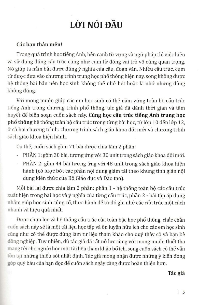 Với mong muốn giúp các em học sinh có thể nắm vững toàn bộ cấu trúc tiếng Anh trong chương trình phổ thông, tác giả đã biên soạn cuốn sách Cùng học cấu trúc tiếng Anh Trung học phổ thông - hệ thống toàn bộ cấu trúc trong từng bài học từ lớp 10 đến lớp 12 kèm những bài tập áp dụng giúp các em củng cố, thực hành để từ đó ghi nhớ các cấu trúc một cách nhanh và hiệu quả nhất.